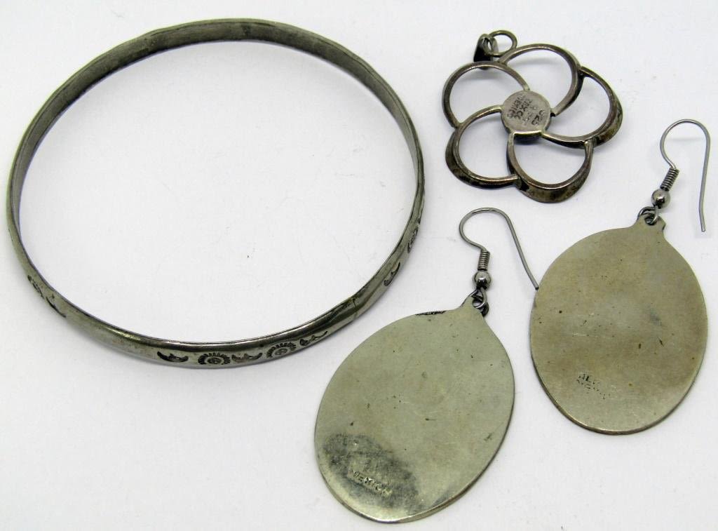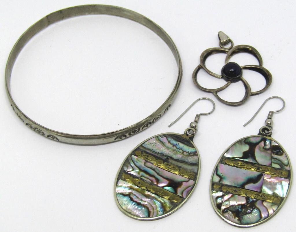 DANGLY EARRINGS WITH ABILONE INLAY (1)BANGLE WITH SUN AND MOON ENGRAVED DESIGN (1)FLOWER PENDANT WITH BLACK CENTER STONE-TOTAL 18.5 DWT