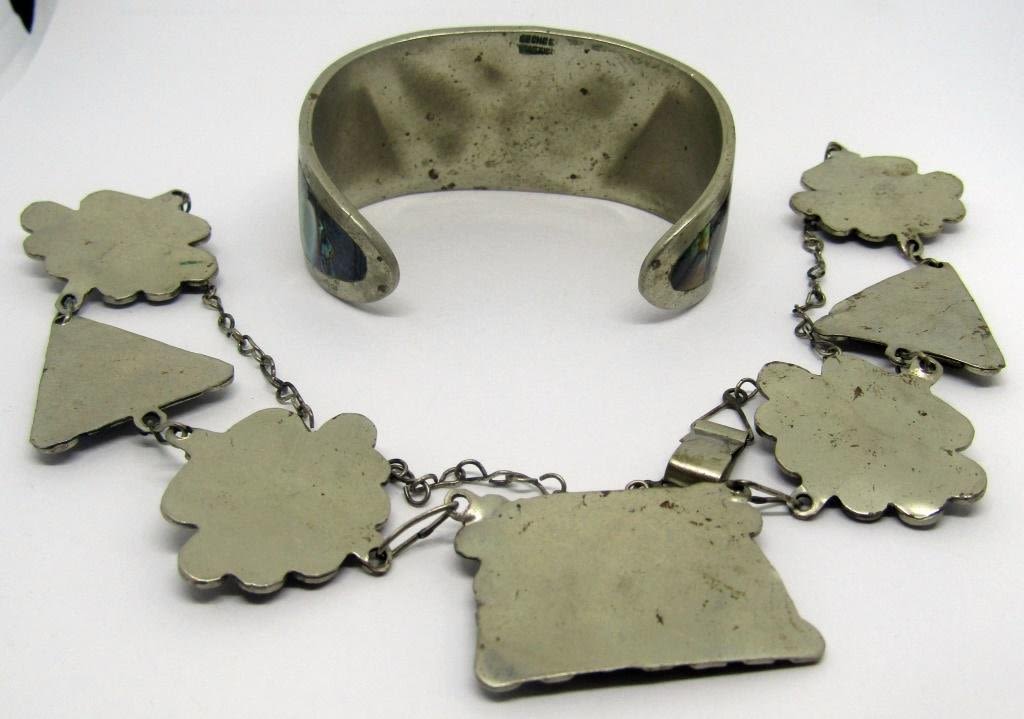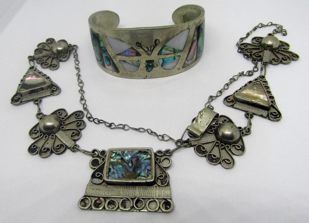 MEXICO SOUTHWEST NECKLACE 18" & CUFF BRACELET w/BUTTERFLY DESIGN – BOTH WITH ABALONE – 38.1 DWT