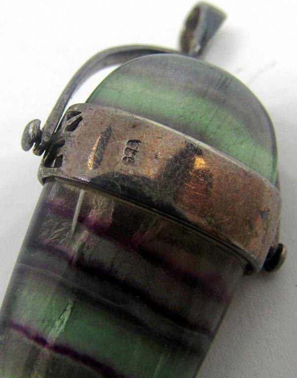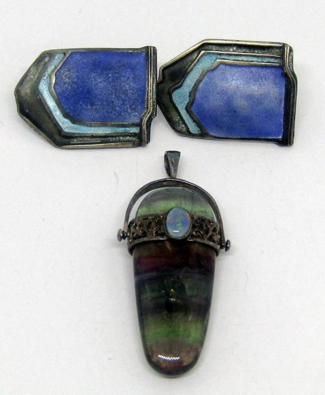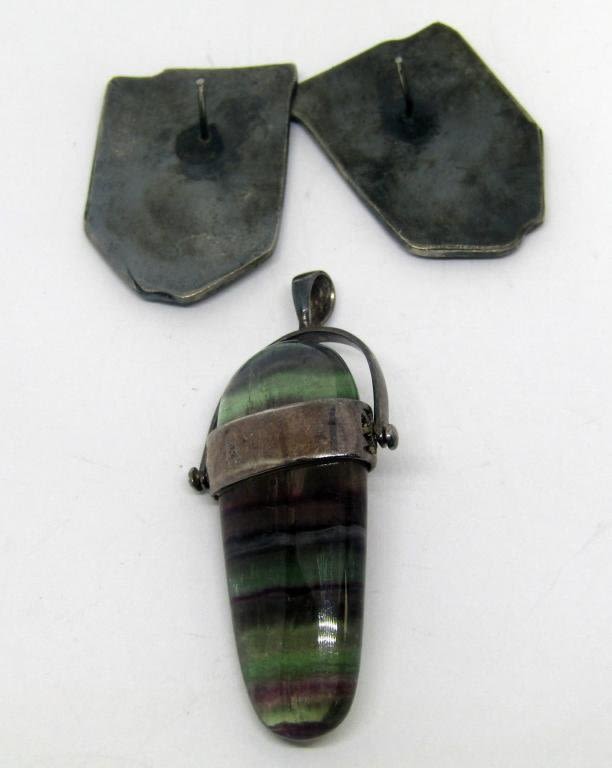 UNIQUE STRIPED STONE PENDANT w/OPALITE & ENAMEL INLAY PIERCED EARRINGS – 12.6 DWT