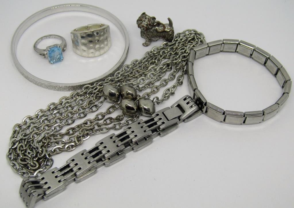 BRACELET MARKED MONET , TWO RINGS, EXTRA LONG NECKLACE, DOG PENDANT MARKED CM, 2 STAINLESS STEEL BRACELETS