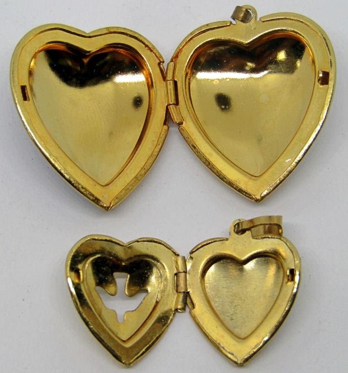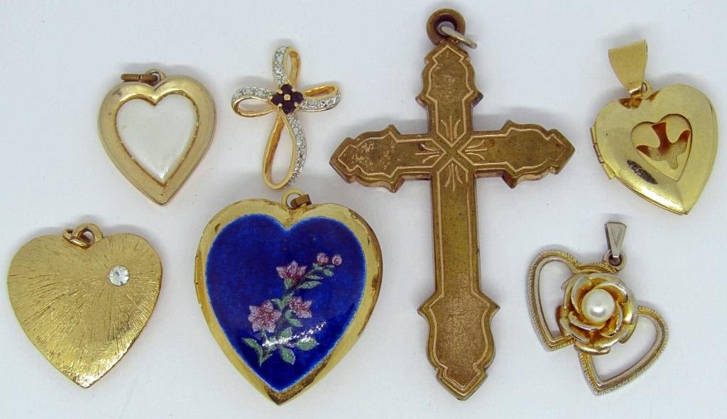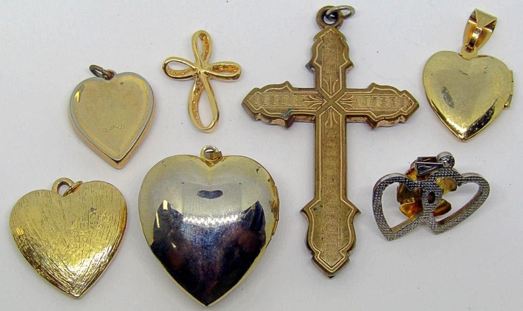GOLD TONED, 2 LOCKETS, 3 HEART SHAPES, 2 CROSSES. 1 MARKED TRIFARI!