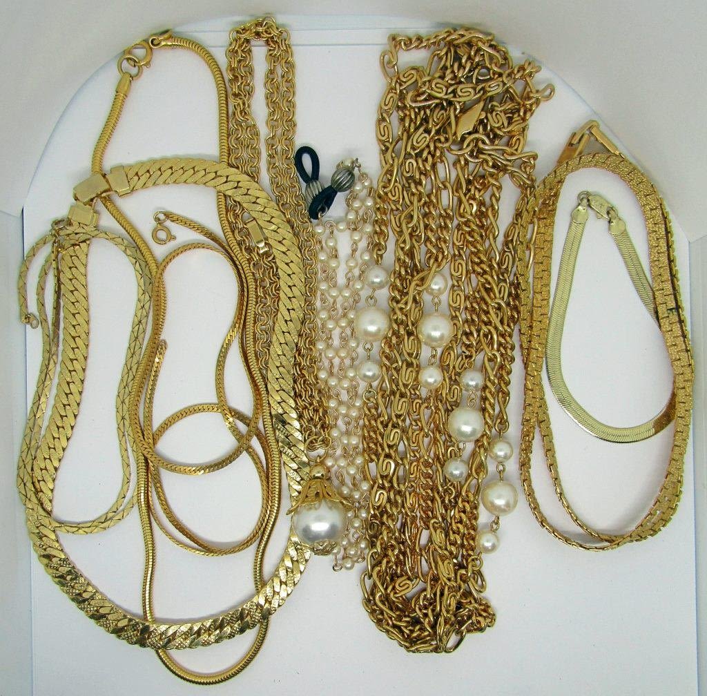 8 GOLD TONED VARIOUS LENGTH NECKLACES AND ONE GOLD TONED BRACELET