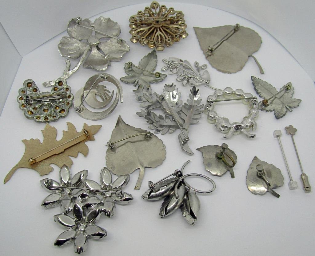 SILVER TONED 9 BROOCHES, 2 HAT PINS, 3 PINS (2 MATCHING) , MATCHING BROOCH AND SCREW ON EARRING SET
