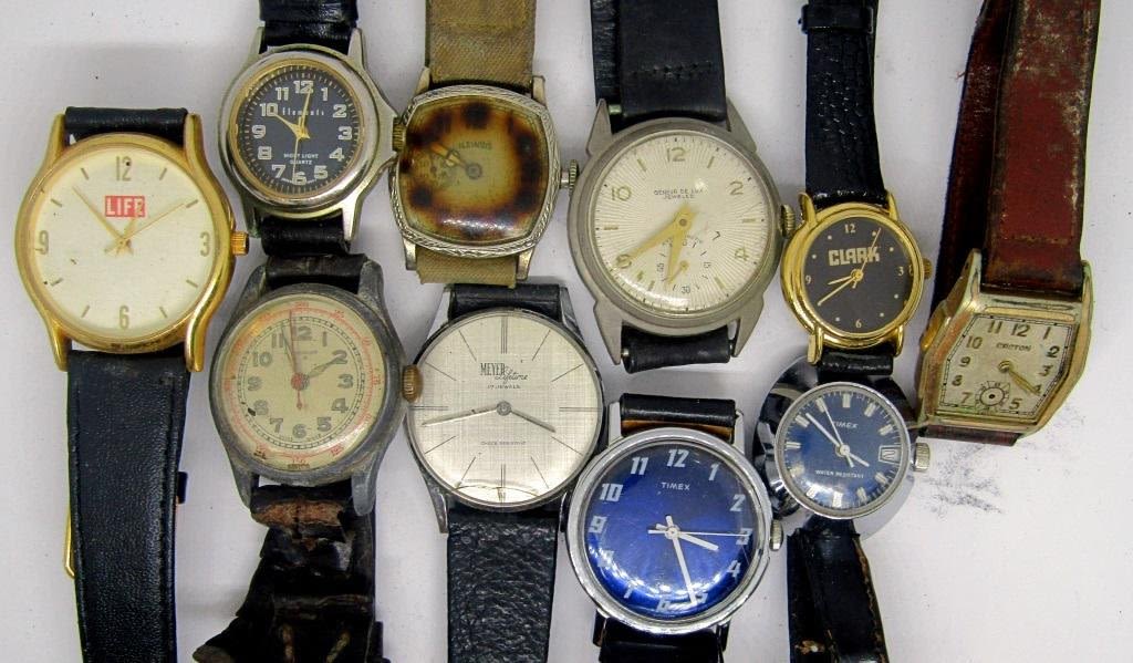 GENEVA DE LUX, CROTON, ELEMENTS, MEYER LIFETIME, CLARK, LIFE, TIMEX, ILLINOIS, SWISS – UNTESTED – PARTS/REPAIR