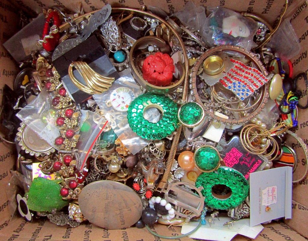 EACH LOT is UNIQUE! ABSOLUTELY A TREASURE HUNT – SOME PIECES MISSING STONES or NEEDING REPAIRED – GREAT FOR THE PINTEREST / CRAFT PERSON. MANY ITEMS NAMED – MEDIUM FLAT RATE BOX FULL (Shipping is MED. FLAT RATE COST)