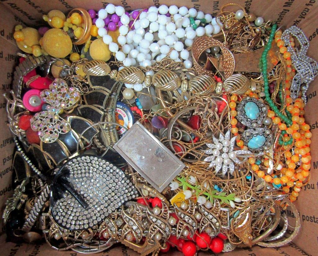 EACH LOT is UNIQUE! ABSOLUTELY A TREASURE HUNT – SOME PIECES MISSING STONES or NEEDING REPAIRED – GREAT FOR THE PINTEREST / CRAFT PERSON. MANY ITEMS NAMED – MEDIUM FLAT RATE BOX FULL (Shipping is MED. FLAT RATE COST)