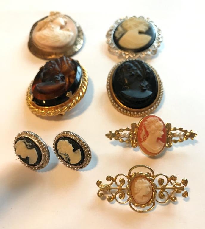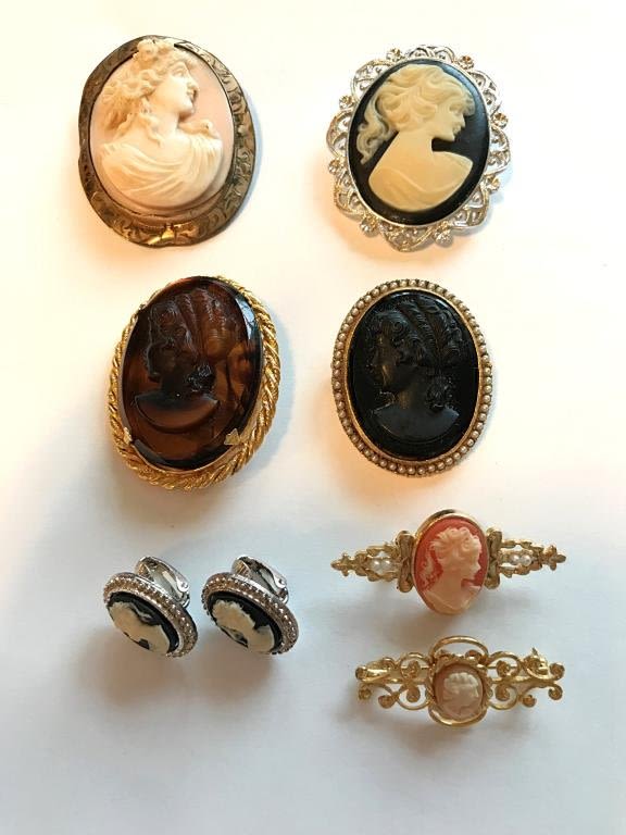 6 BROOCHES AND ONE PAIR OF EARRINGS