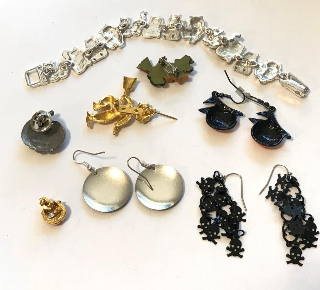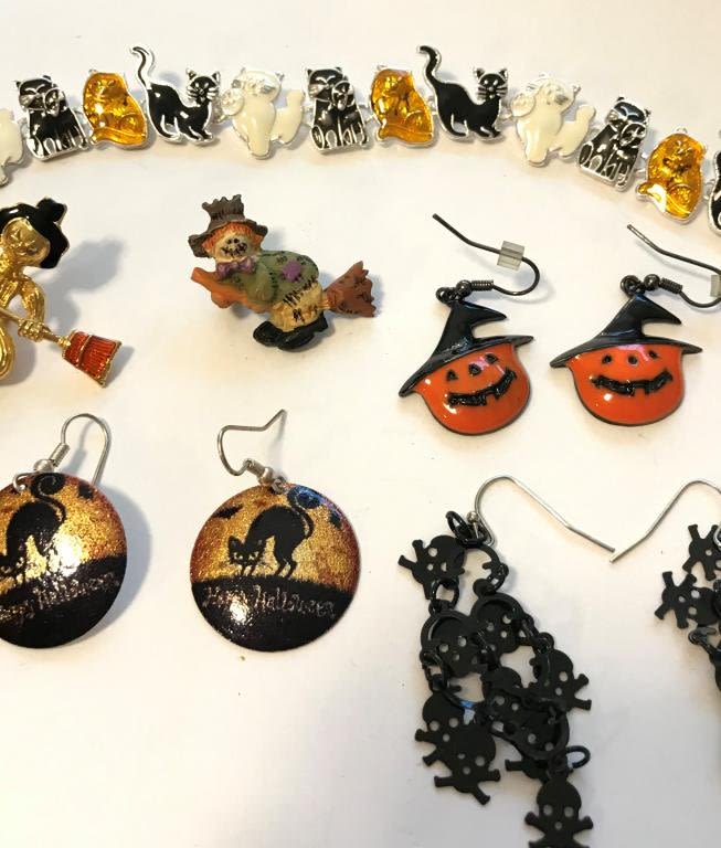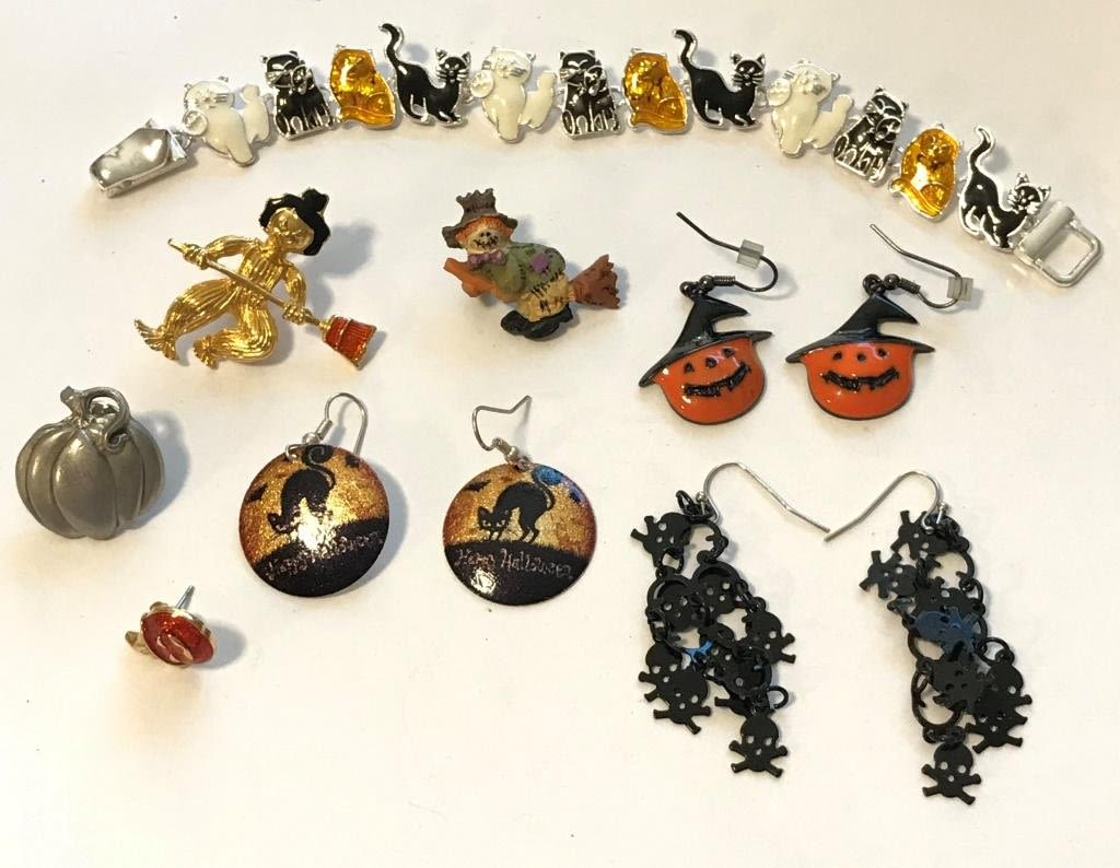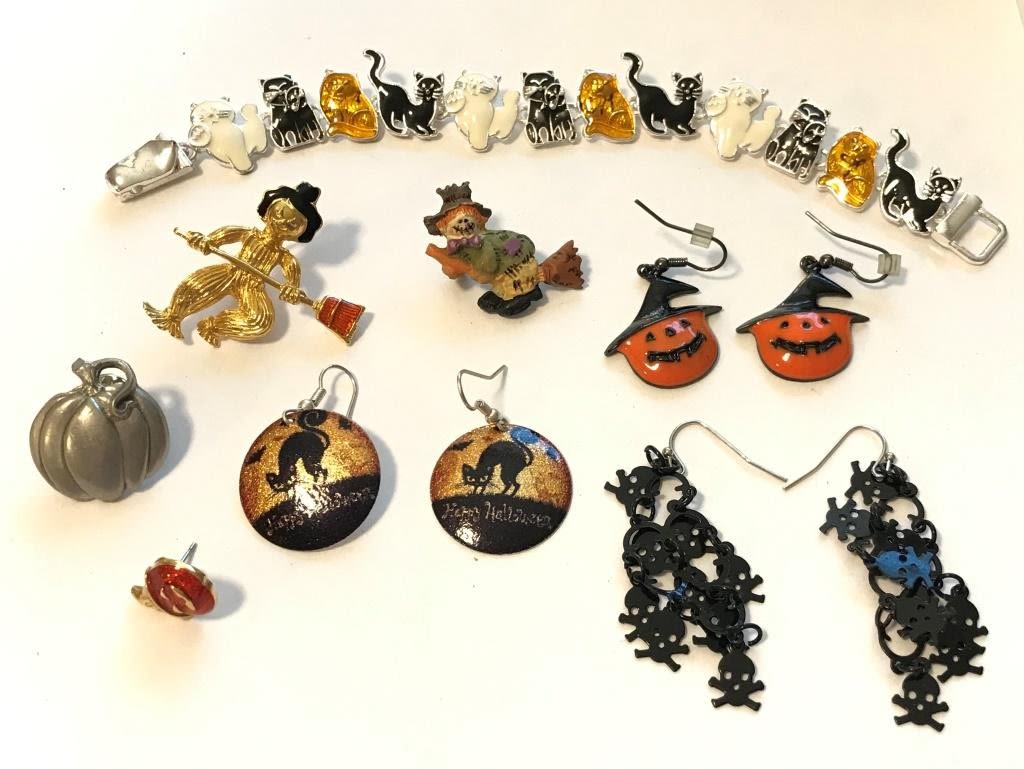 1 MARKED LCD & AVON, ONE MARKED BRACELET, EARRINGS, PIN/ BROOCH– CATS, PUMPKINS SCARECROWS