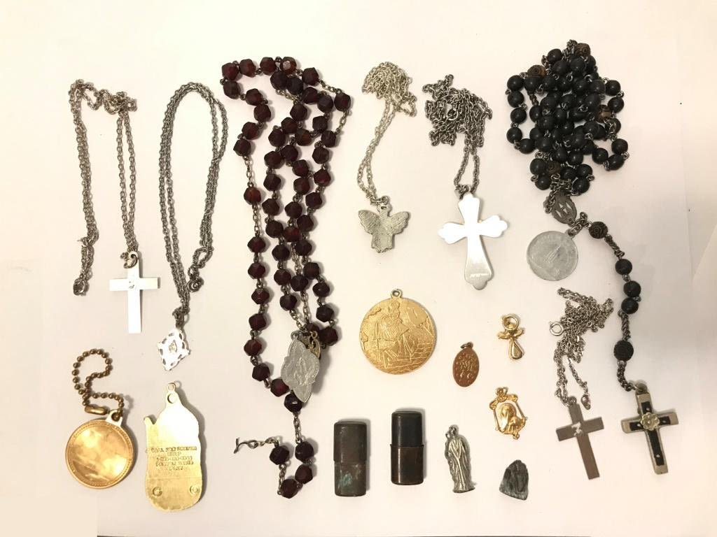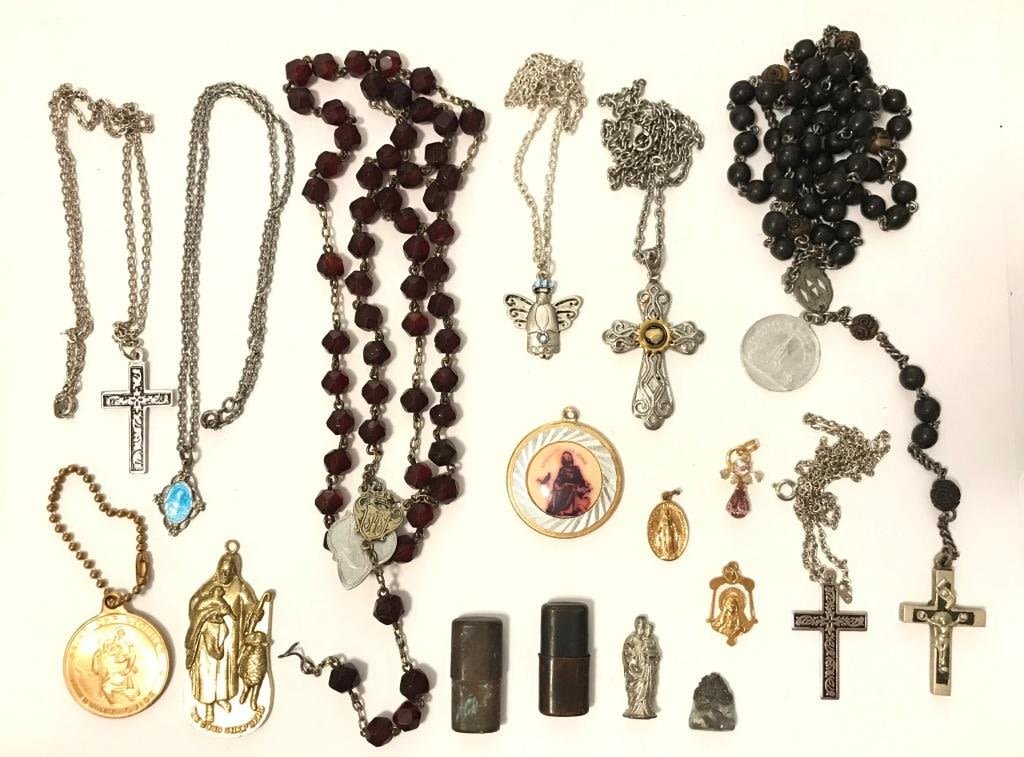 ROSARIES, NECKLACES, PENDANTS, ANGELS, ANGEL, CROSS, — 2 PIECES ARE THE BOTTOM ARE SOLID AND GO INSIDE THE TWO CASES
