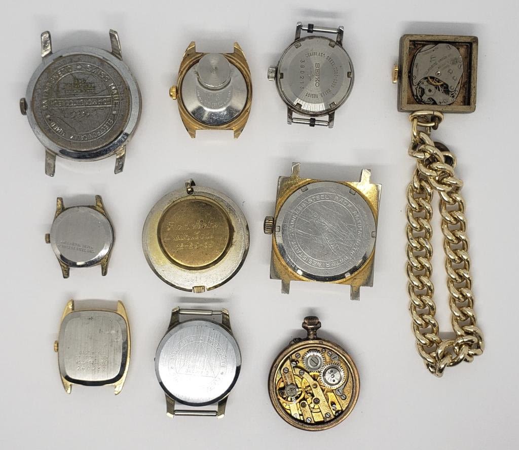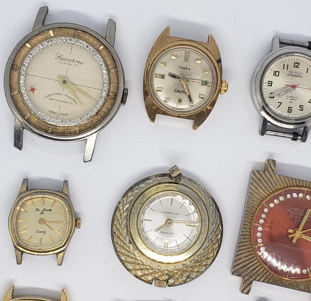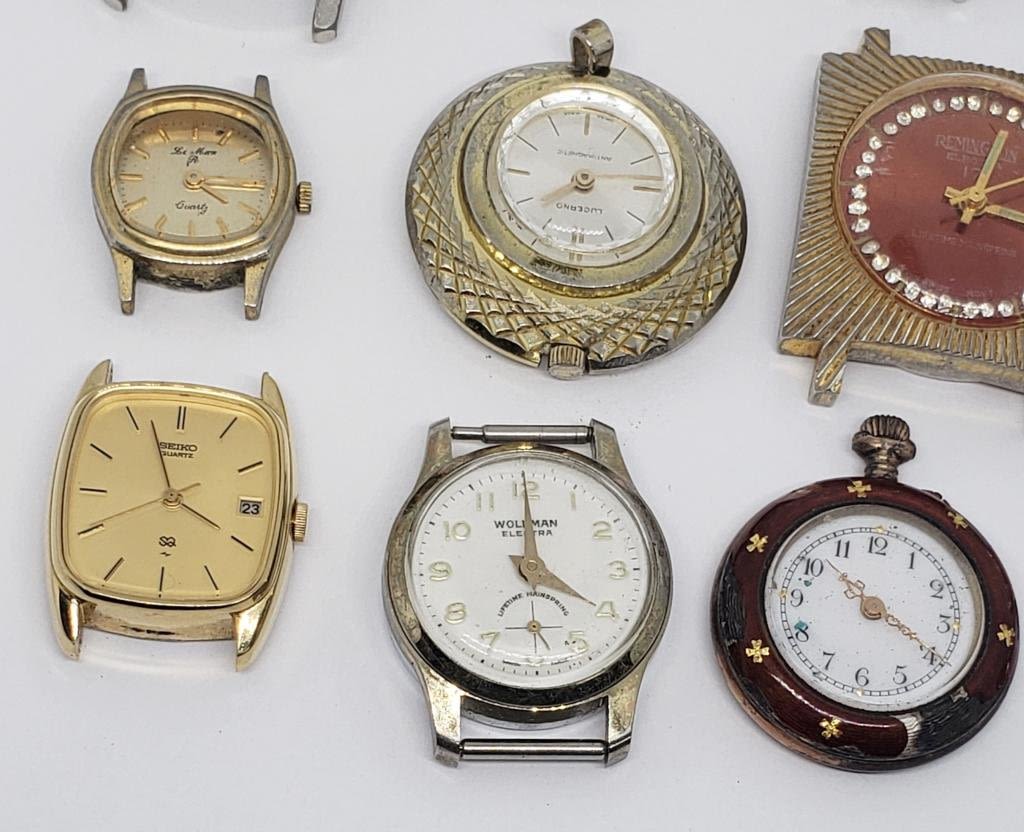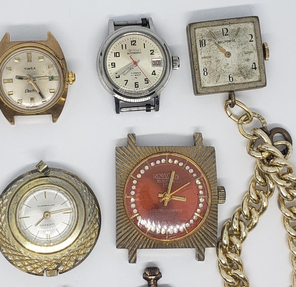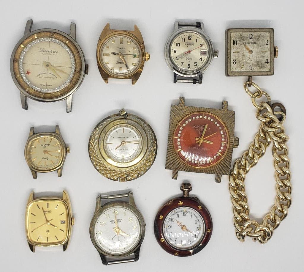(1)SEIKO AUTOMATIC 17 JEWELS #390216 (1)REMINGTON (1)LUCERNE ORBIT (1)LE MOON QUARTZ (1)BELFORTE (MISSING CRYSTAL) (1)SEIKO QUARTZ (1)WOLDMAN ELECTRA (1)TIMEX ELECTRIC-UNTESTED-FOR PARTS/REPAIR