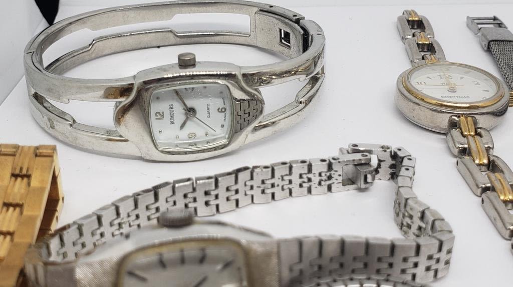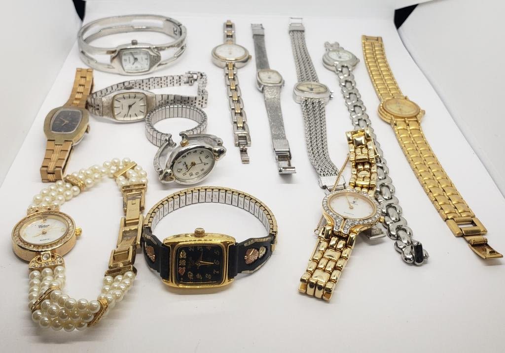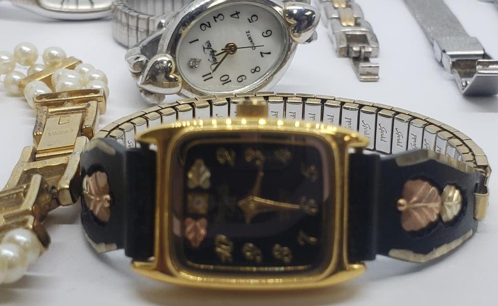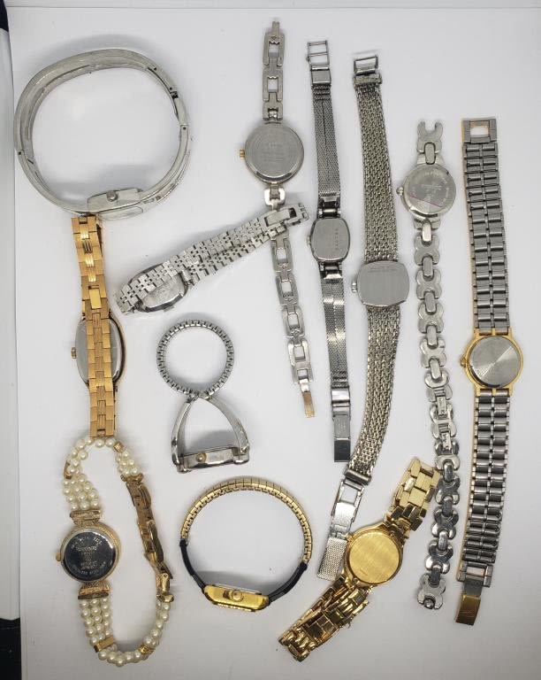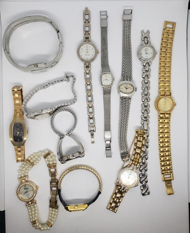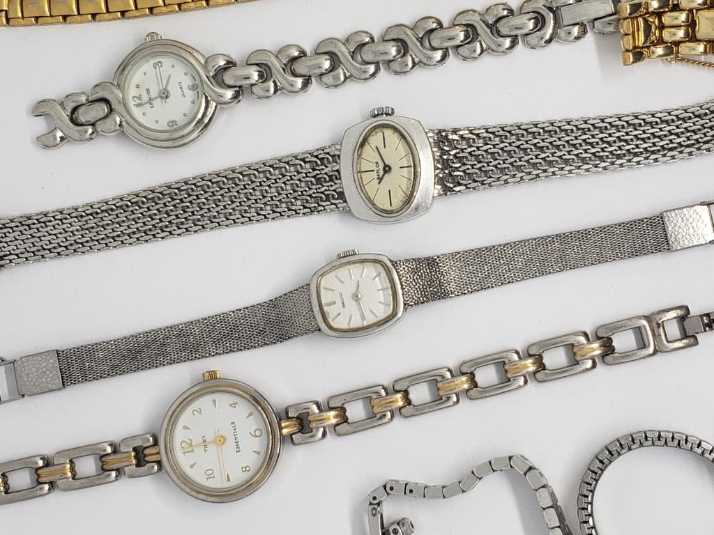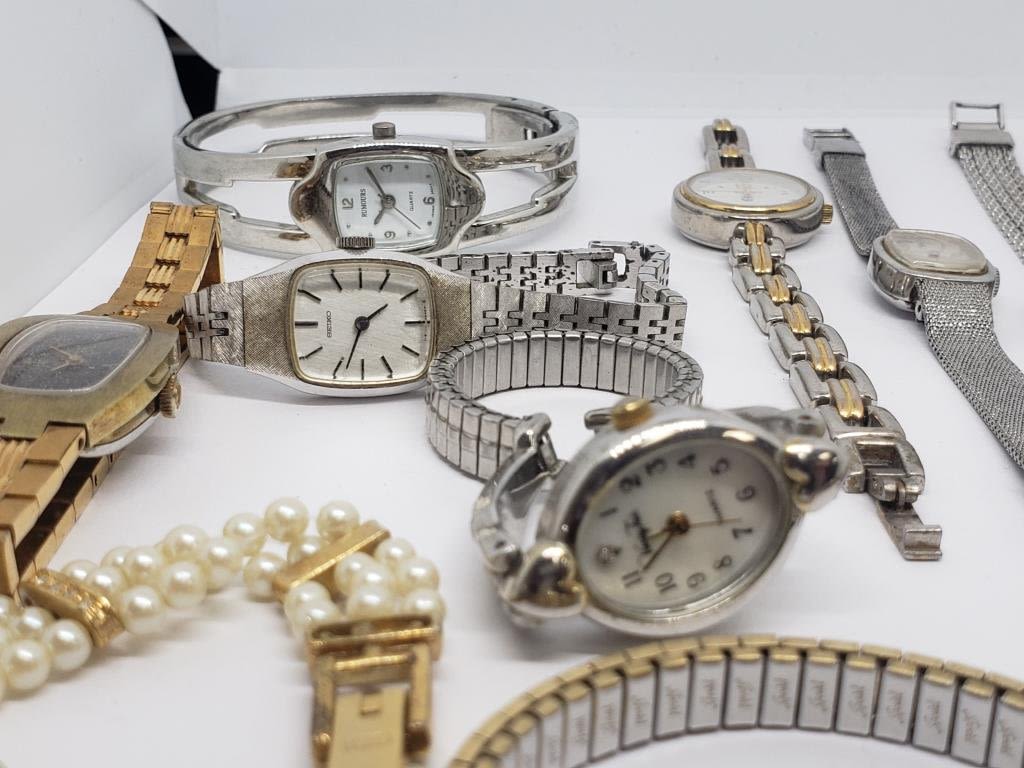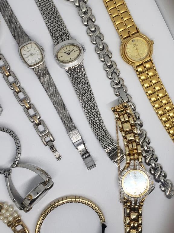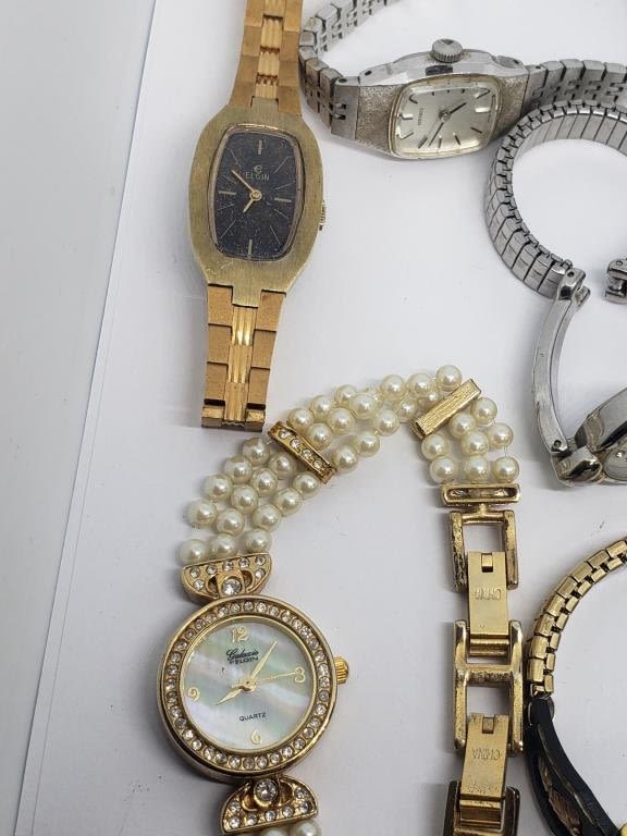 ELGIN QUARTZ WITH RHINESTONES FAUX PEARLS (1)GENEVE QUARTZ GOLD TONED WITH RHINESTONES (1)BAYLOR (1)DIAMOND BLACK HILLS GOLD QUARTZ (2)SEIKO (1)TIMEX (4)QUARTZ-UNTESTED-SAME MAY NEED REPAIR