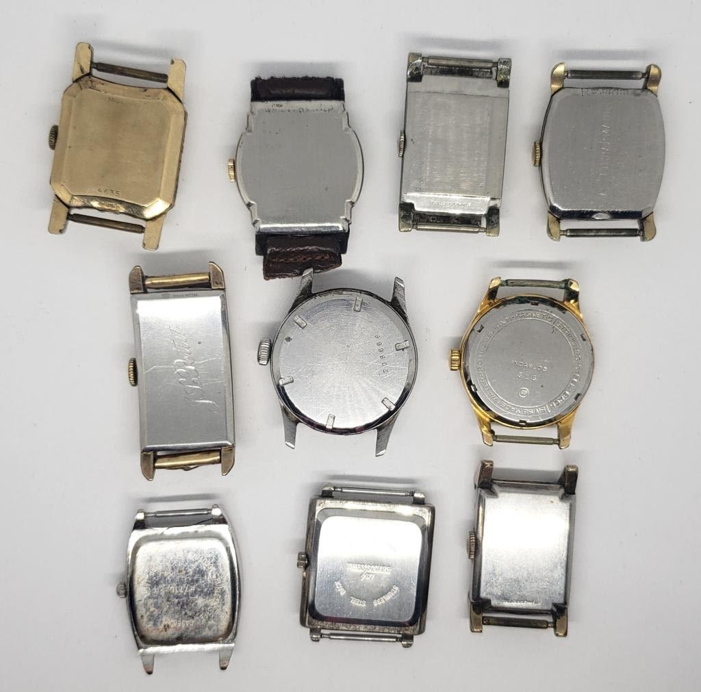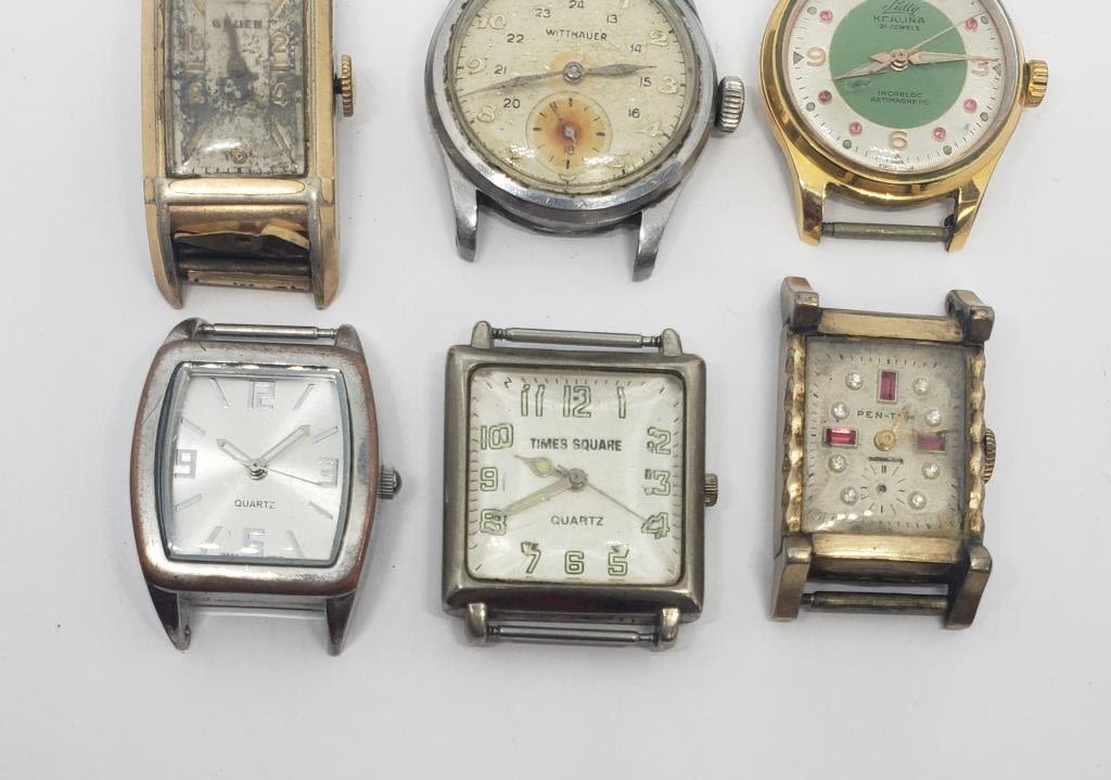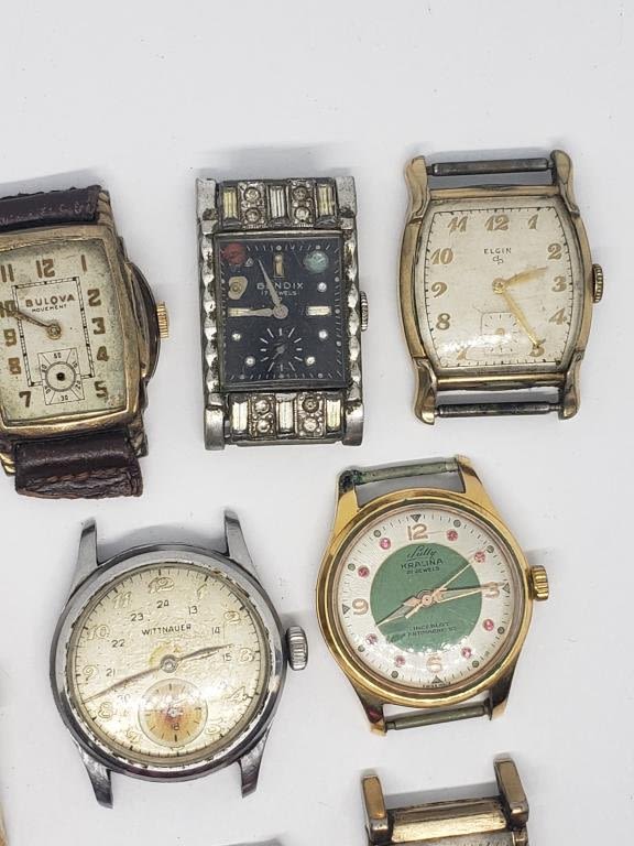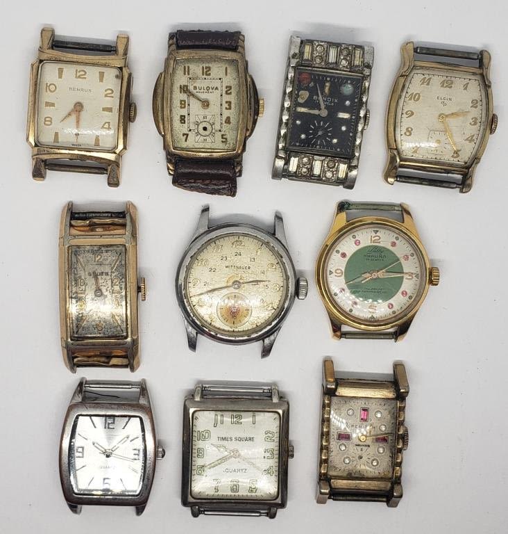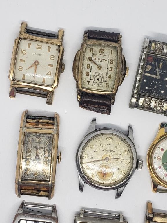 (1)BENRUS #4635 (1)QUARTZ (1)PEN-TYM (1)BULOVA (MISSING CRYSTAL) (1)TIMES SQUARE QUARTZ (1)WITTNAUER #209666 (1)ELGIN 10 RGP BEZEL (1)GRUEN (1)BENDIX 17 JEWELS (1)SULLY KARALINA 21 JEWELS-ALL UNTESTED-PARTS/REPAIR