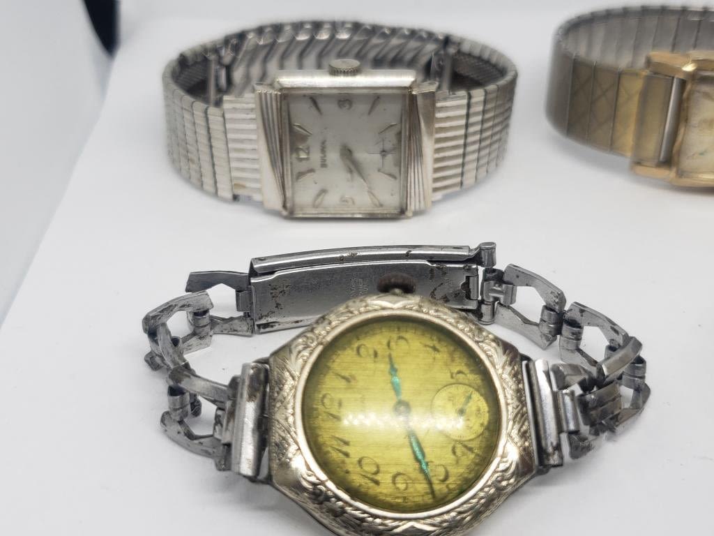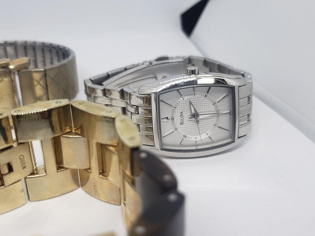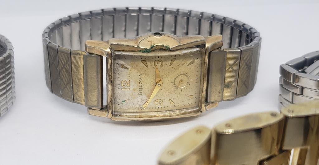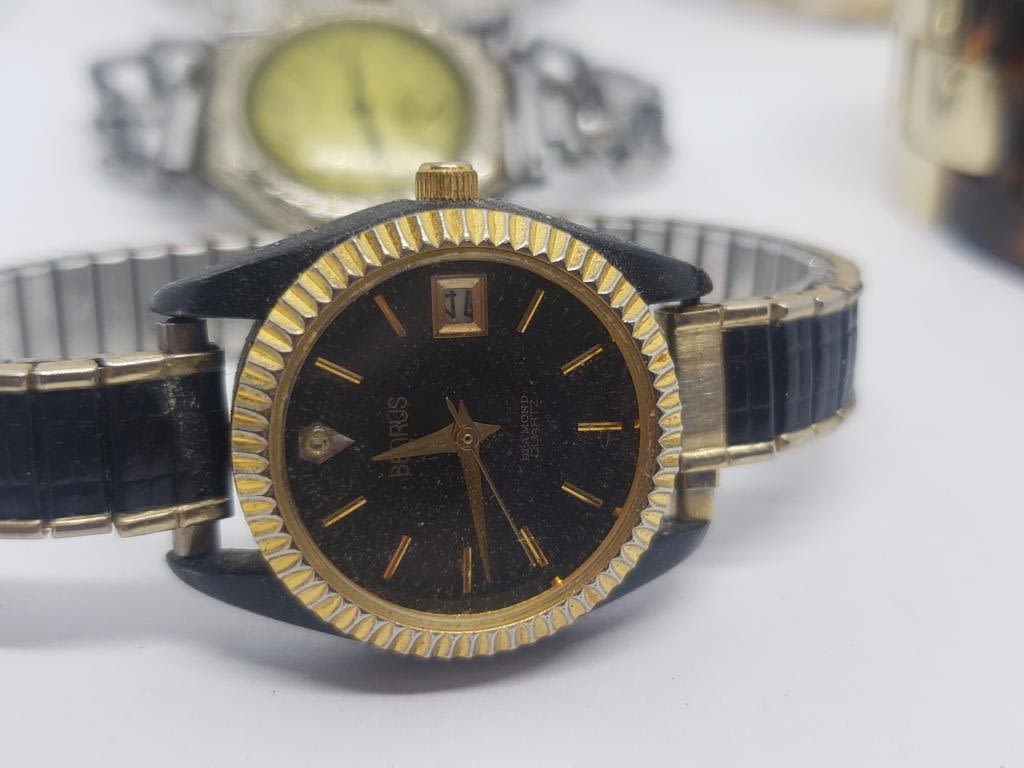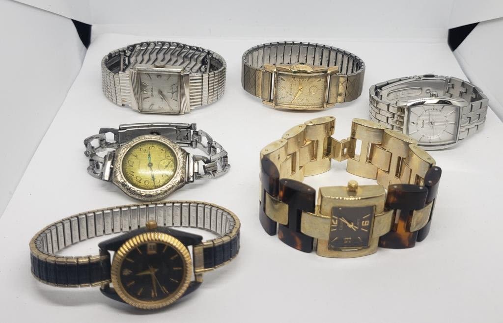 (1)BULOVA 10K RGP #D323508 (1)BENRUS DIAMOND QUARTZ DAY DATE #2015 (1)GRUEN QUARTZ WITH TURTLE BAKELITE BAND (1)BULOVA (1)ELGIN (1)BULOVA 10K RGP #F435035-ALL WATCHES UNTESTED-PARTS/REPAIR