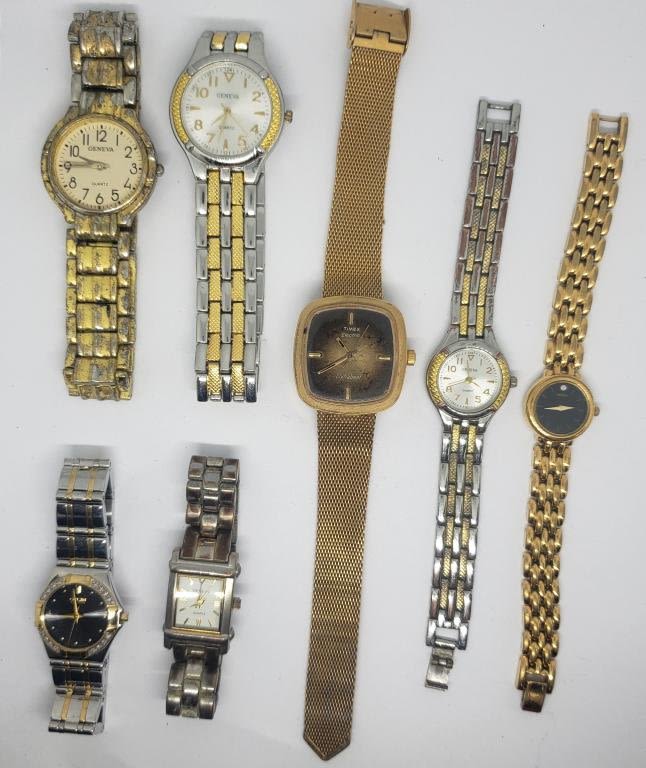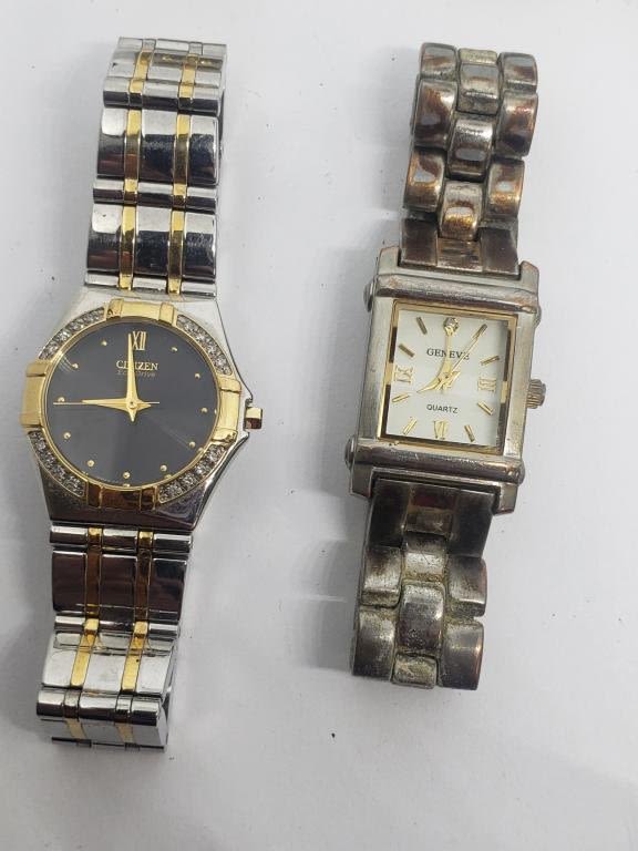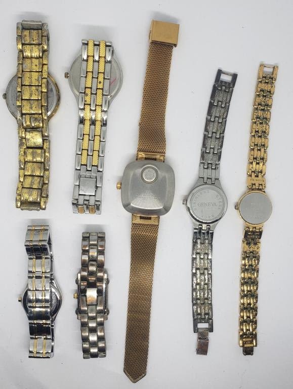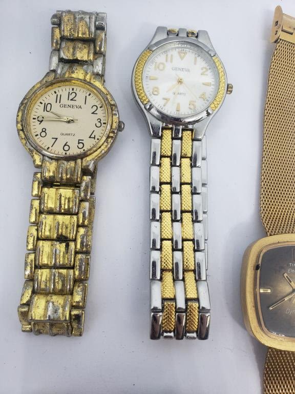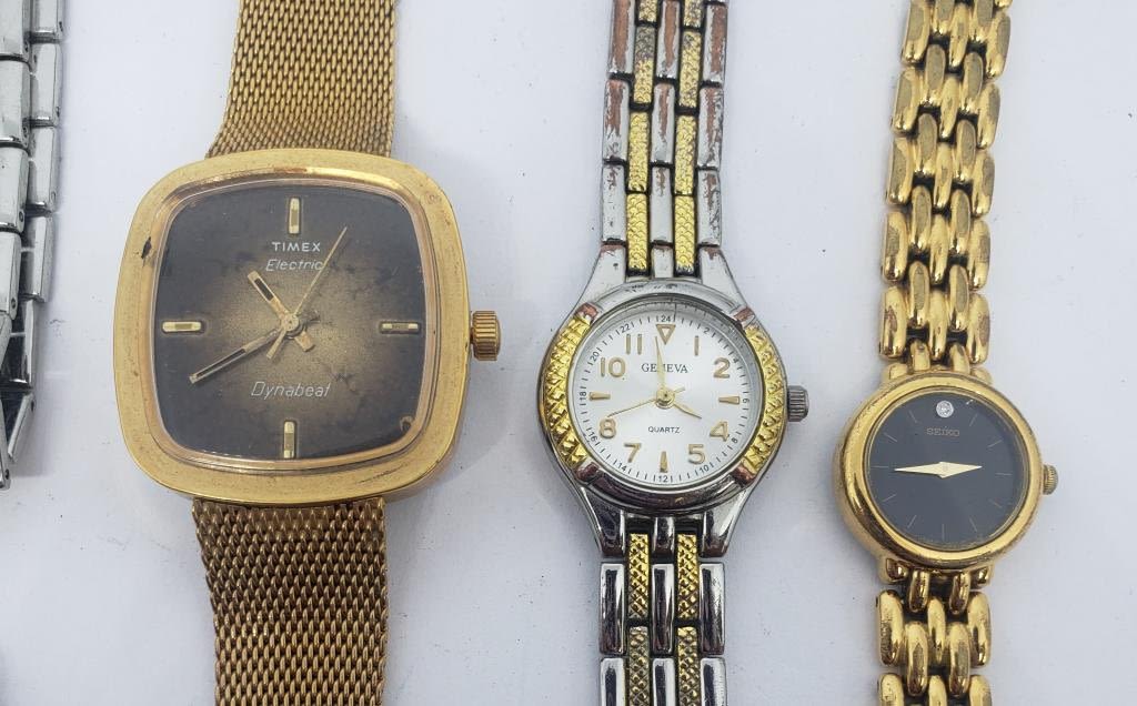 (1)TIMEX DYNABEAT (1)CITIZEN (1)SEIKO #788685 (4)GENEVA (ONE MISSING CRYSTAL)-PARTS/REPAIR