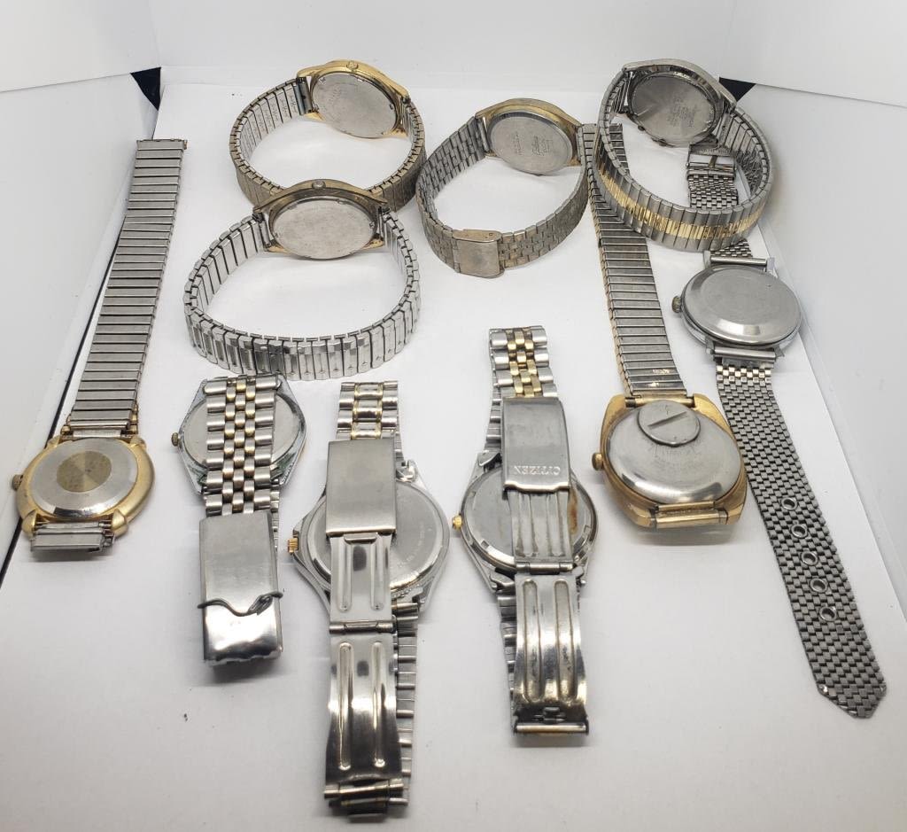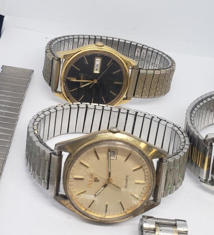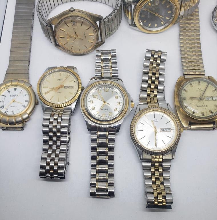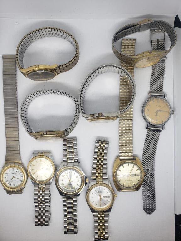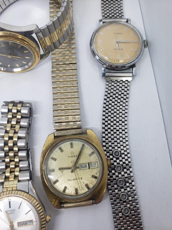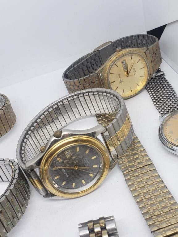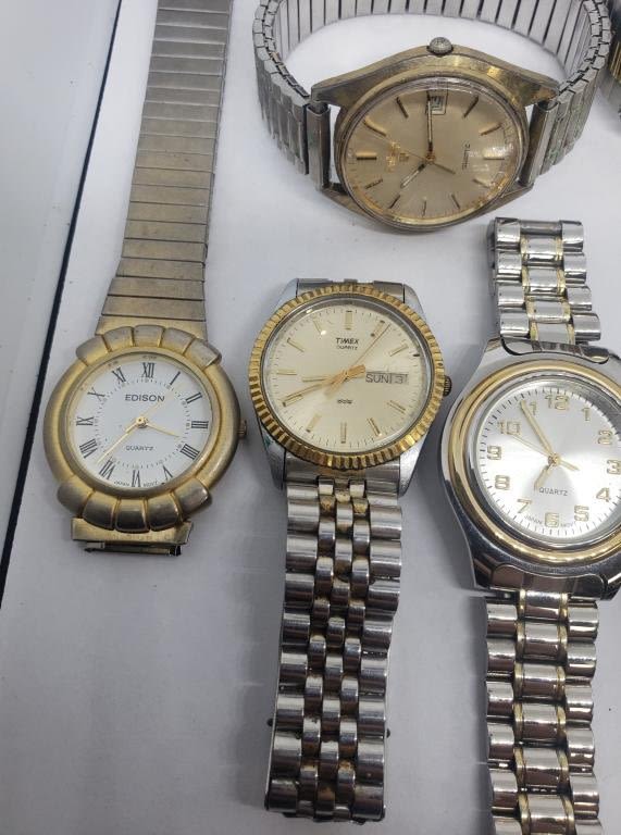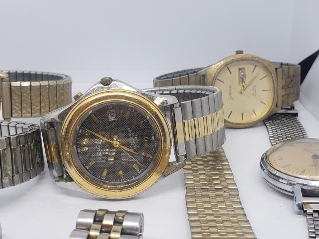 (1)SEIKO QUARTZ DAY DATE (1)TIMEX SELF-WINDING (1)TIMEX QUARTZ DAY DATE (1)GALAXIE ELGIN DAY DATE QUARTZ (1)ELGIN 100 FT QUARTZ DAY DATE (1)EDISON QUARTZ (1)PULSAR QUARTZ DAY DATE (1)CITIZEN QUARTZ