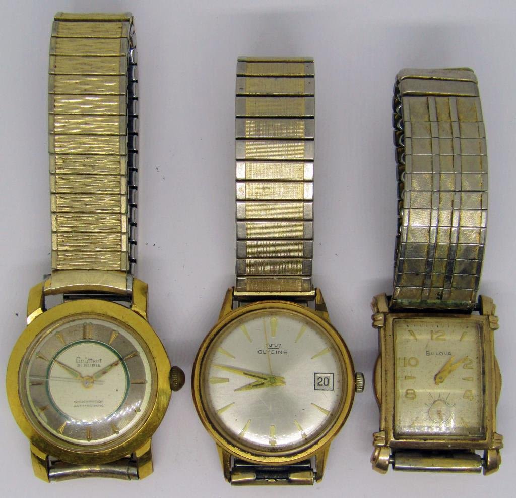 (1)GRUTTERT 21 RUBIS (1)GLYCINE DAY DATE (1)BULOVA #5989619-ALL WATCHES UNTESTED-PARTS/REPAIR