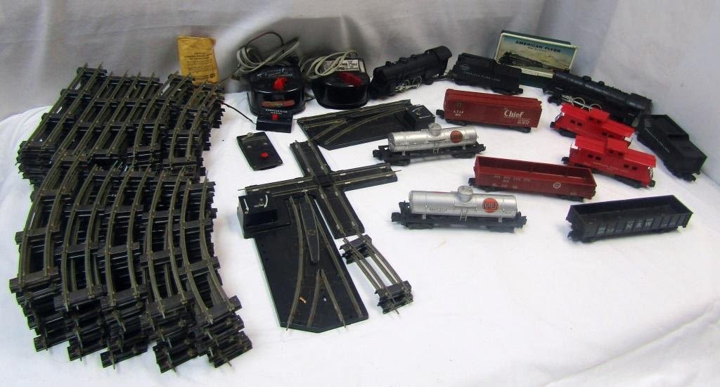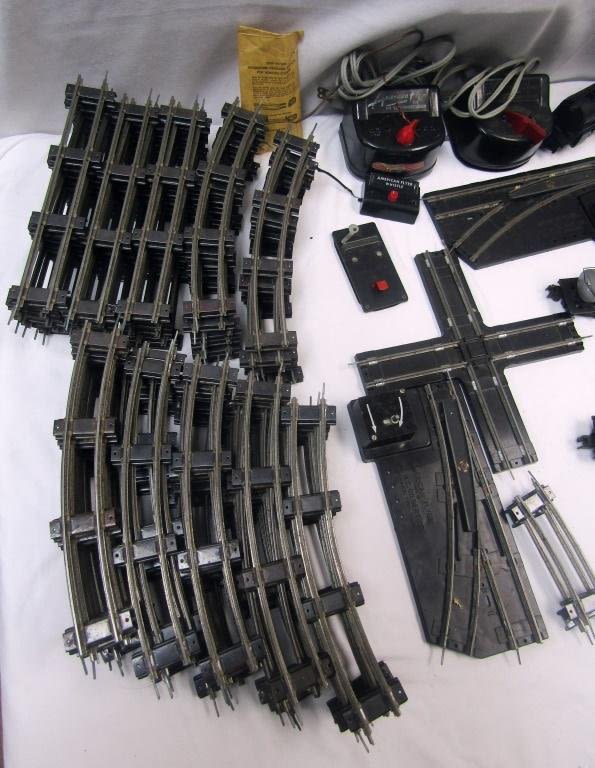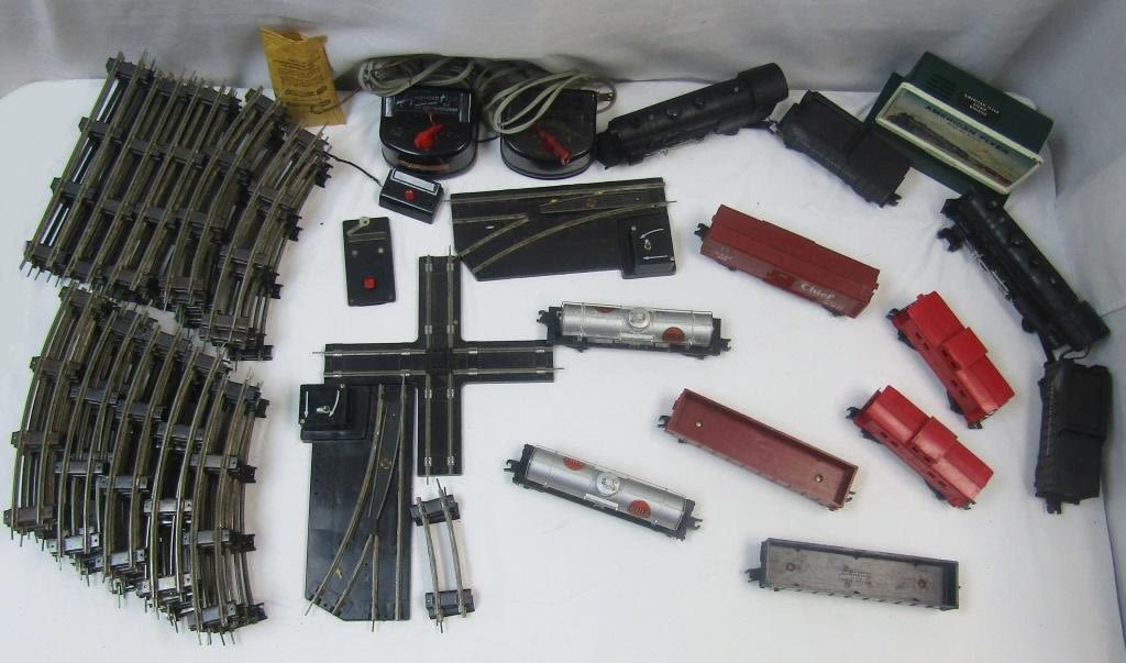 ENGINE / COAL TENDERS #303 & #21160, (2) CABOOSE #806 & #24610, (2) GULF CARS #925 & #24310, (3) CARS #403, #41-6, #803, (2) TRANSFORMERS, MULTIPLE TRACKS, STEAM WHISTLE – NICE VINTAGE SET – UNTESTED – OVER NICE