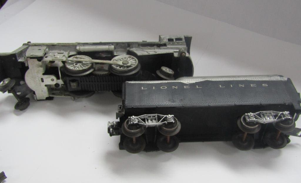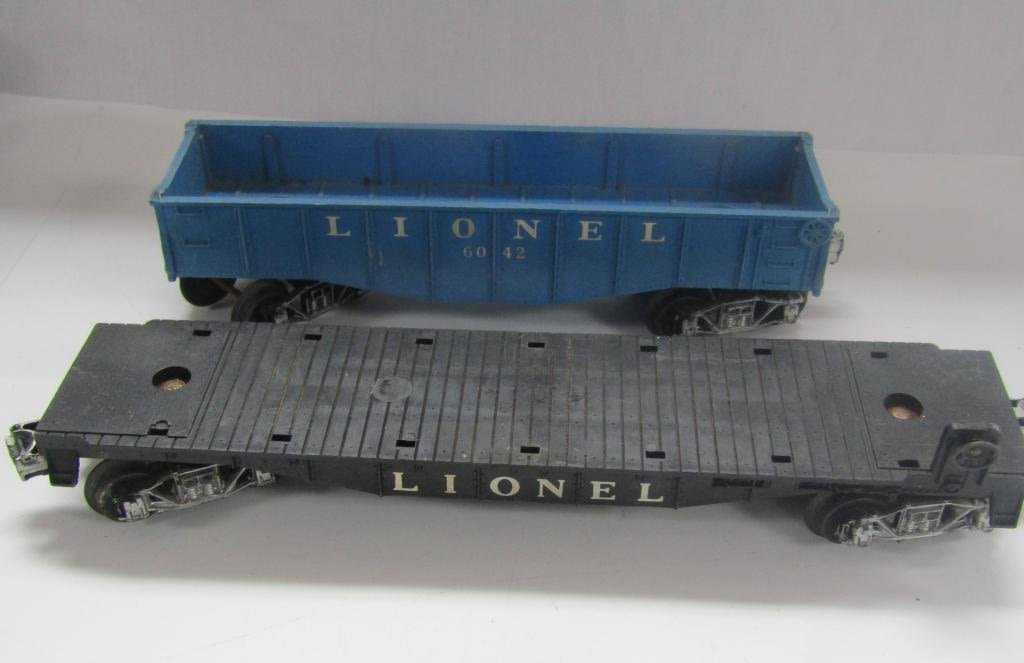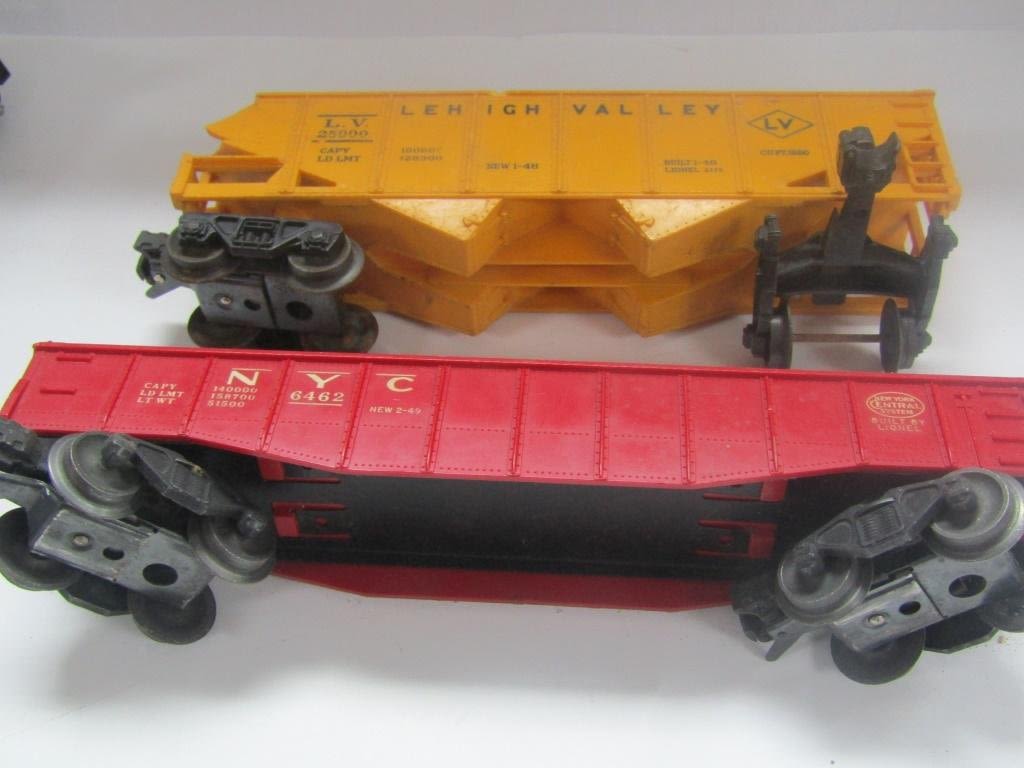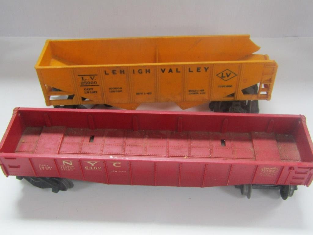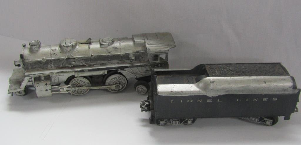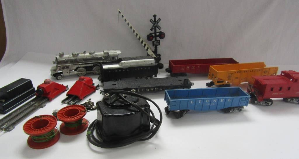 ENGINE 242 PAINTED SILVER, TENDER CAR, #6462 NYC GANDOLA, #6047 CABOOSE, #6511-2 FLAT BED, #6176 LEHIGH VALLEY GANDOLA, #6042 BLUE GANDOLA, (2) #260 BUMPERS, CROSSING GATE SIGNAL LIGHT, TYPE 1073 TRANSFORMER