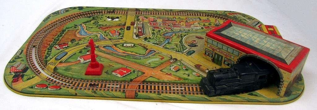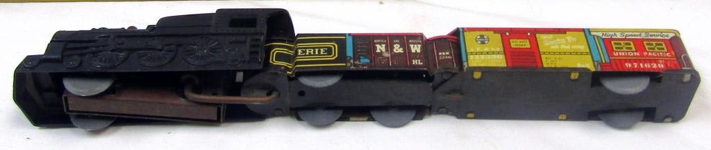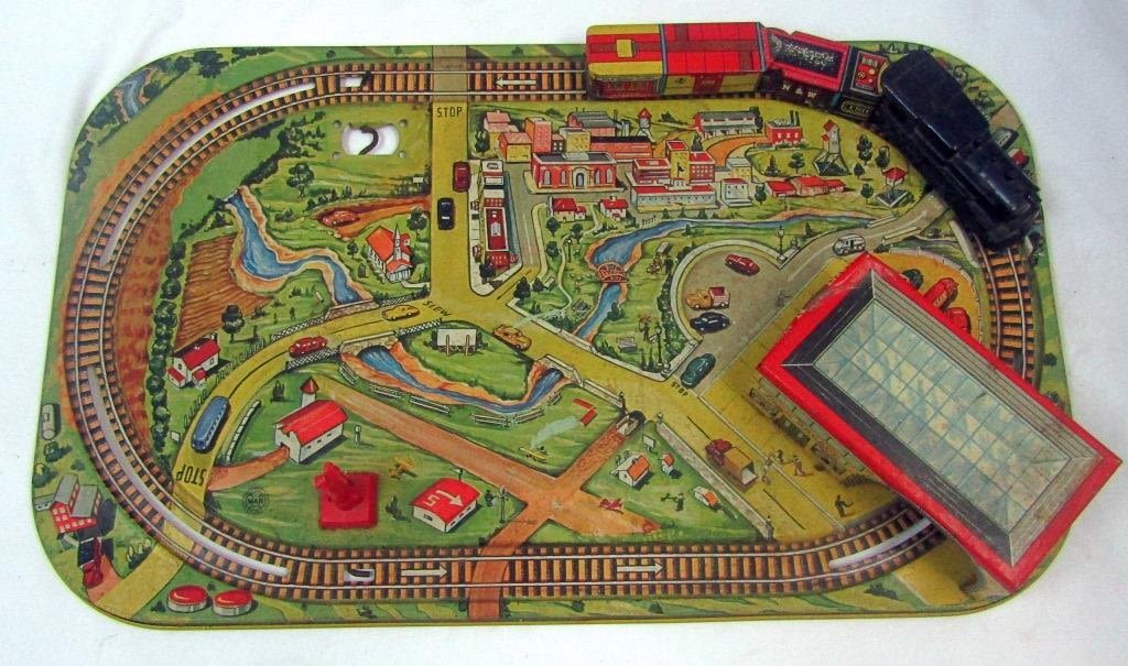WIND-UP TRAIN with (2) TIN CARS – NO KEY – 22" x 13" TIN TRAIN STATION