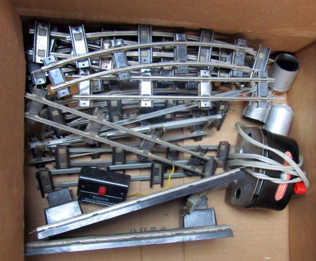 LIONEL 736 ENGINE, COAL CAR, #3927 CAR PLUS 6 SMALLER SIZE cars, 7 straight and 13 curved tracks and AMERICAN FLYER transformer