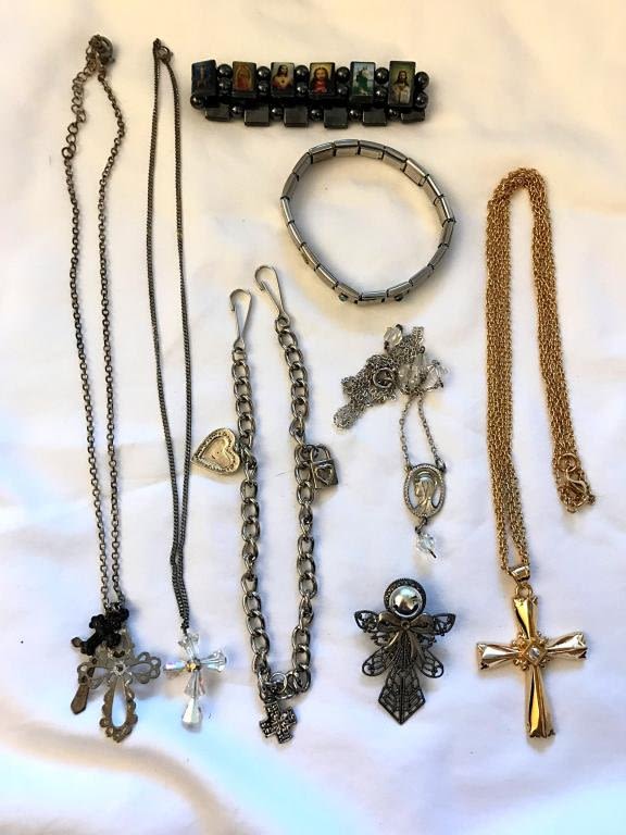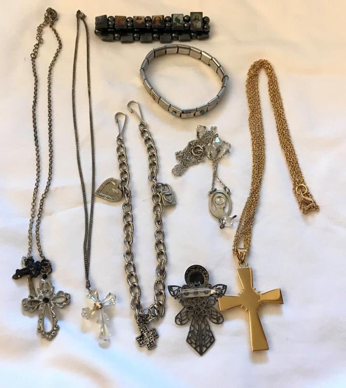 4 NECKLACES, ANGEL BROOCH, 3 BRACELETS