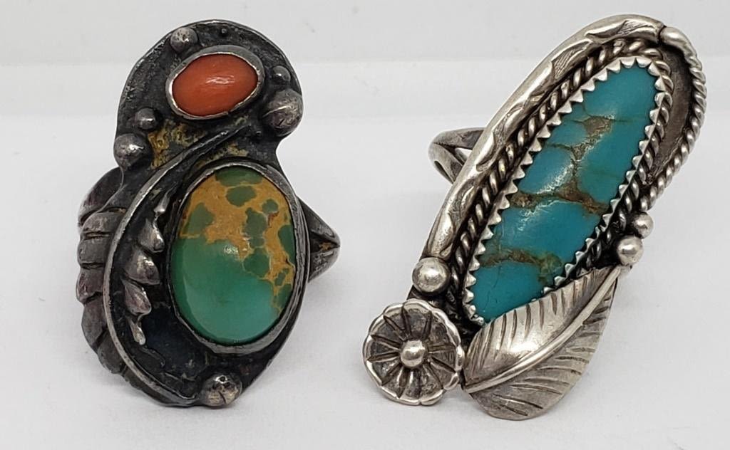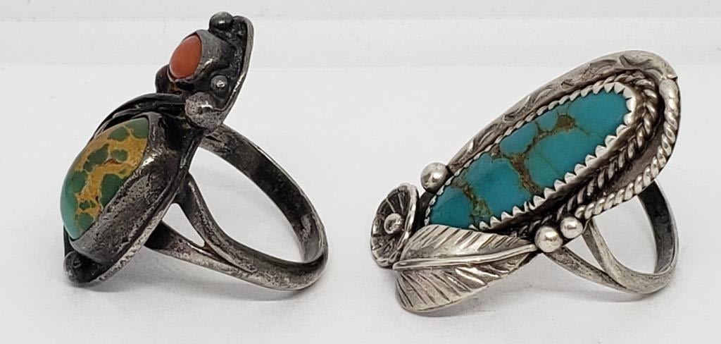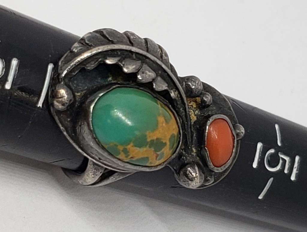 RED CORAL AND GREEN STONE ACCENTS-RING SIZES 7 & 7.5-TOTAL 9.8 DWT