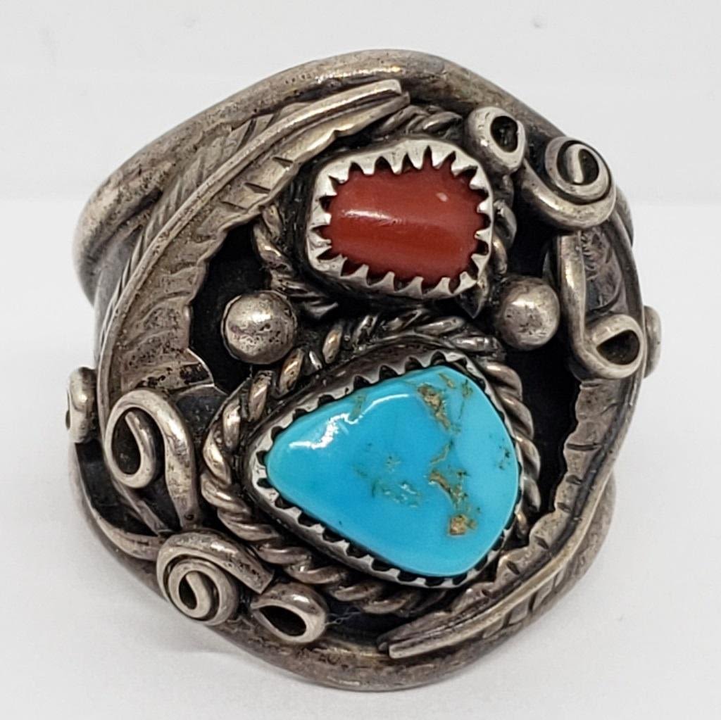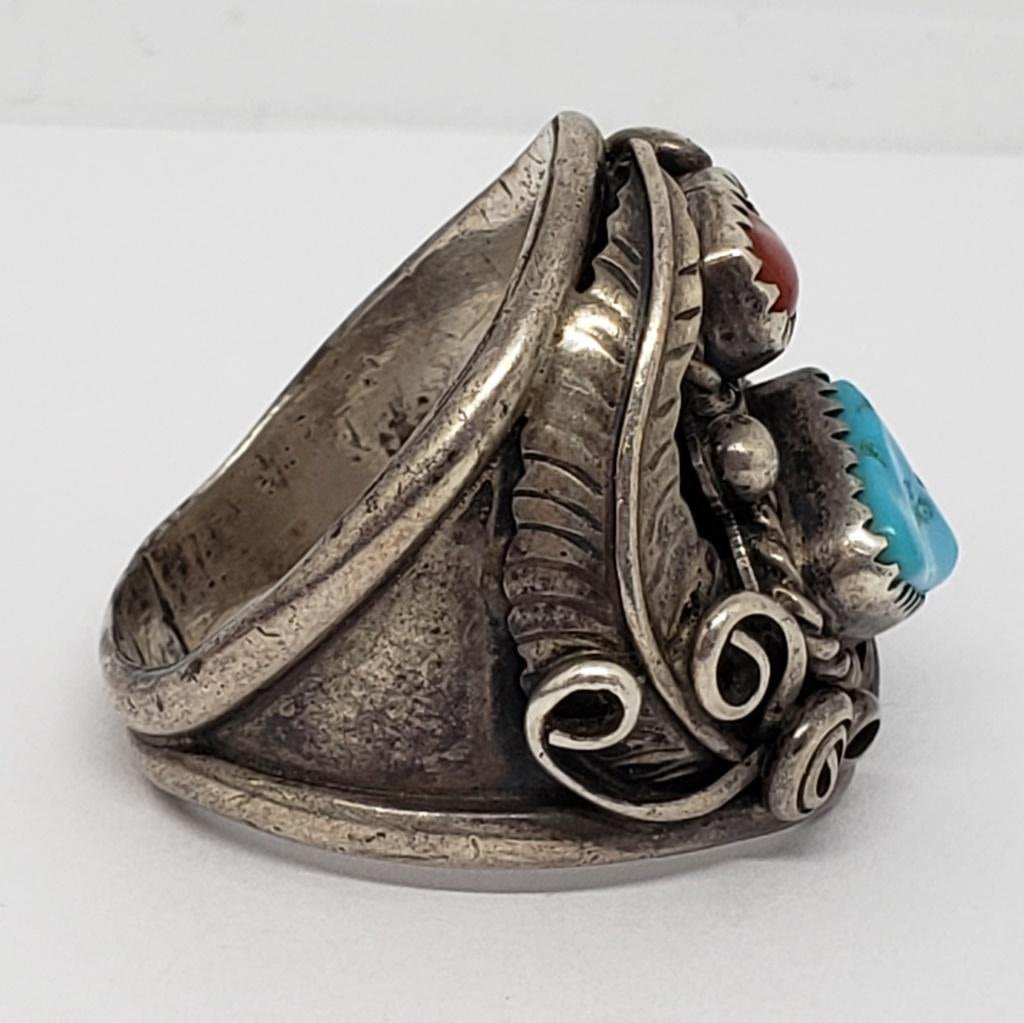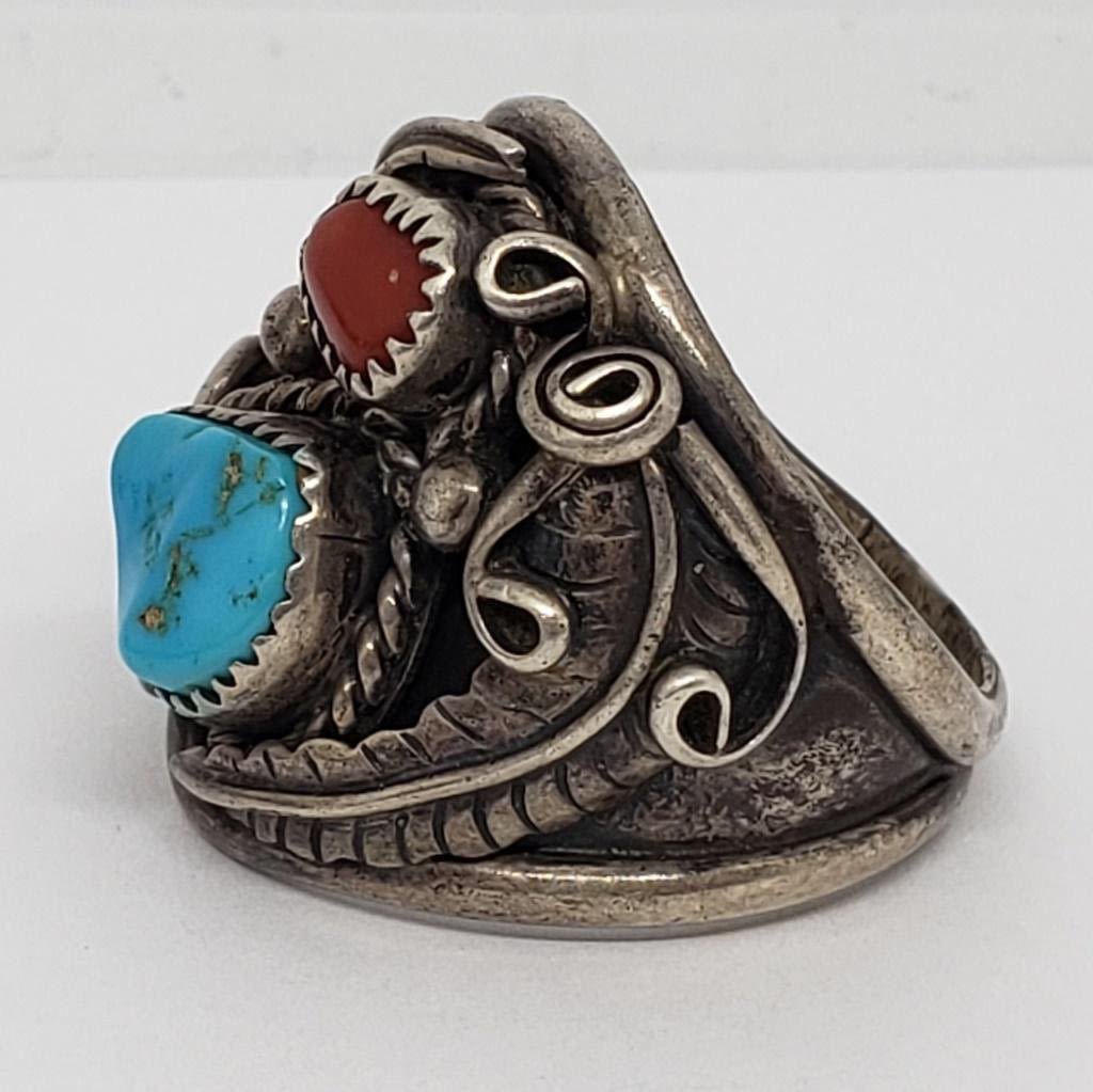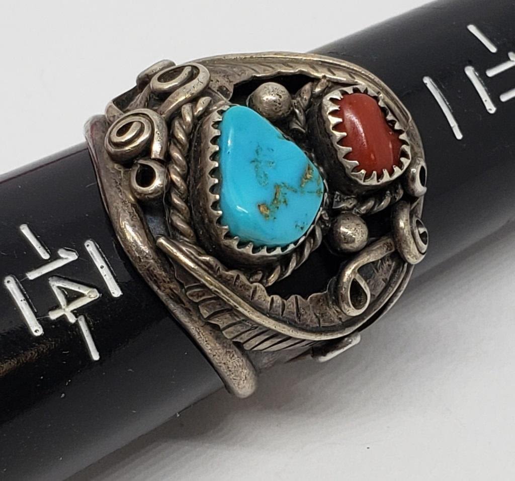 TURQUOISE AND RED CORAL STONE ACCENTS-RING SIZE 13-TOTAL 9.8 DWT