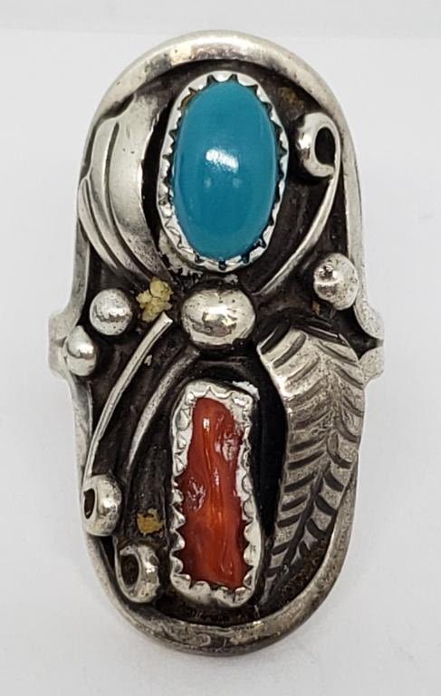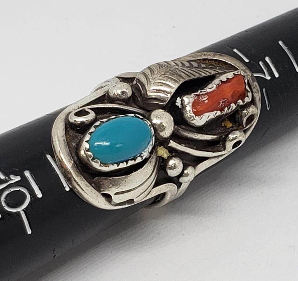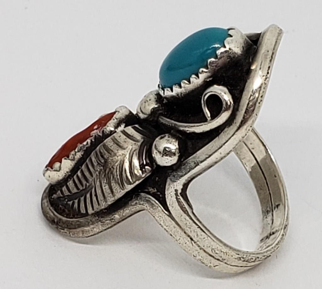 CORAL AND TURQUOISE STONE ACCENTS-RING SIZE 8.5-TOTAL 6.8 DWT
