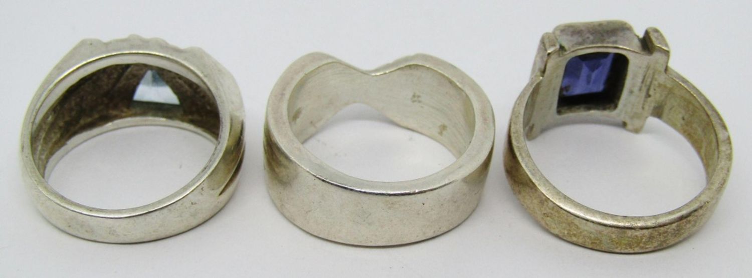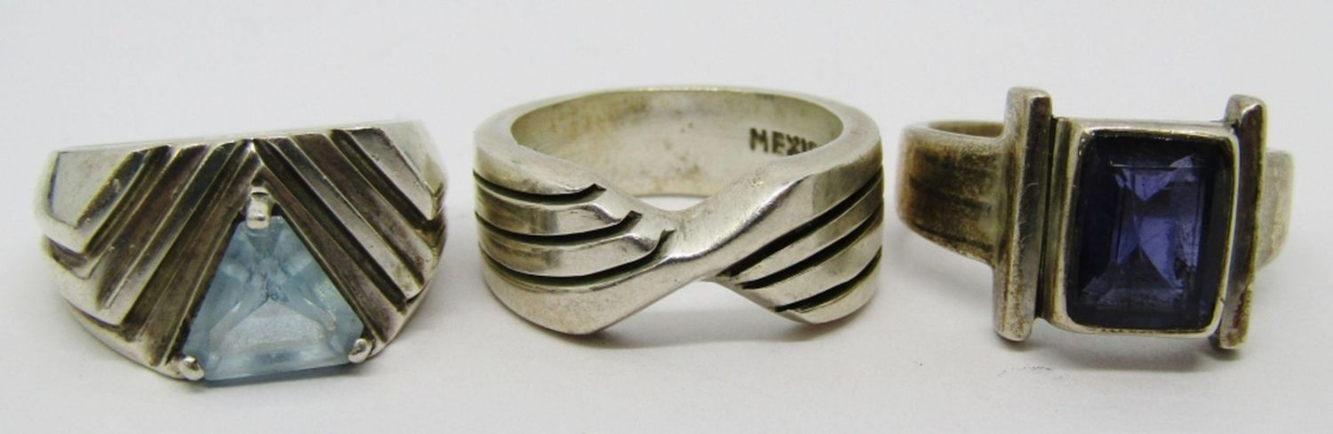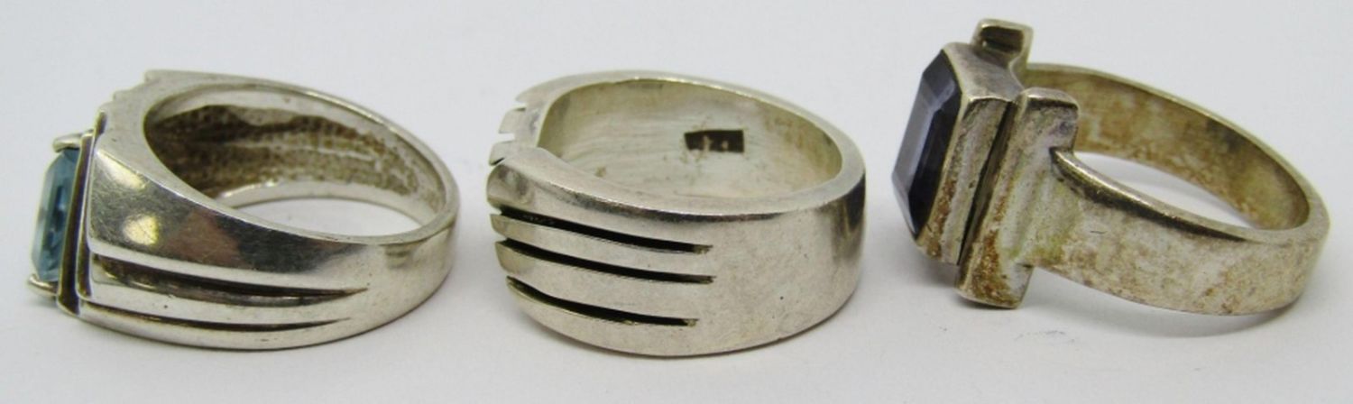 BLUE CENTER STONE (1)WITH NAVY BLUE CENTER STONE-(2)WITH WITH DESIGN ON BANDS-VARIOUS SIZES 6-7-TOTAL 21.2 DWT