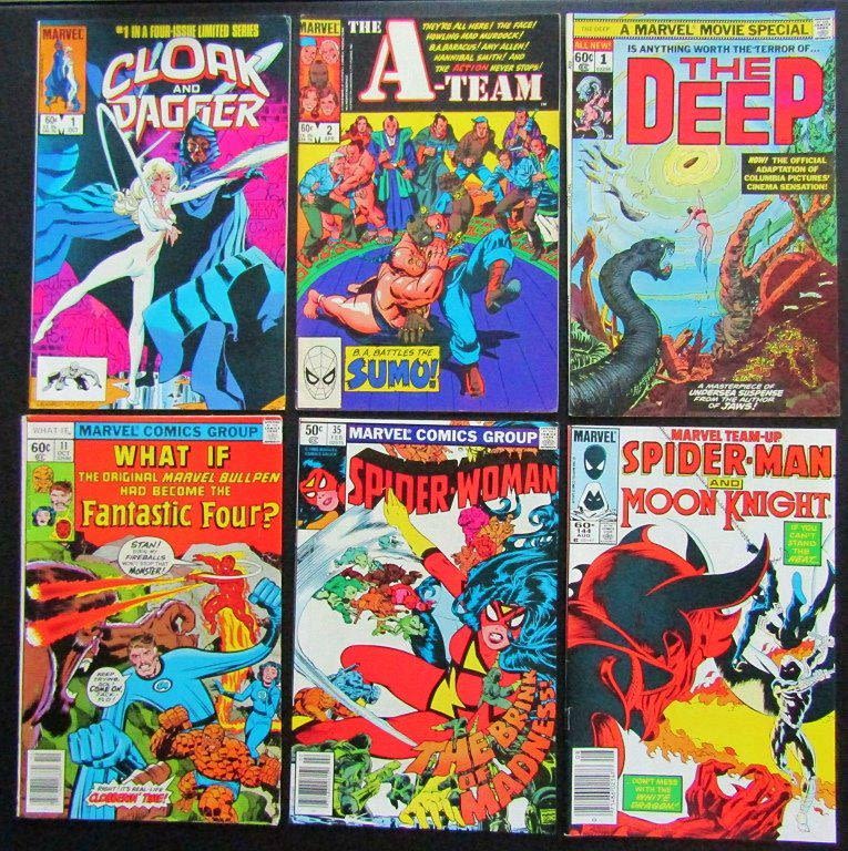 #1 Cloak and dagger, #2 A-Team, #1 The Deep, #11 What if Fantastic Four, #144 Spiderman, Spider woman#35