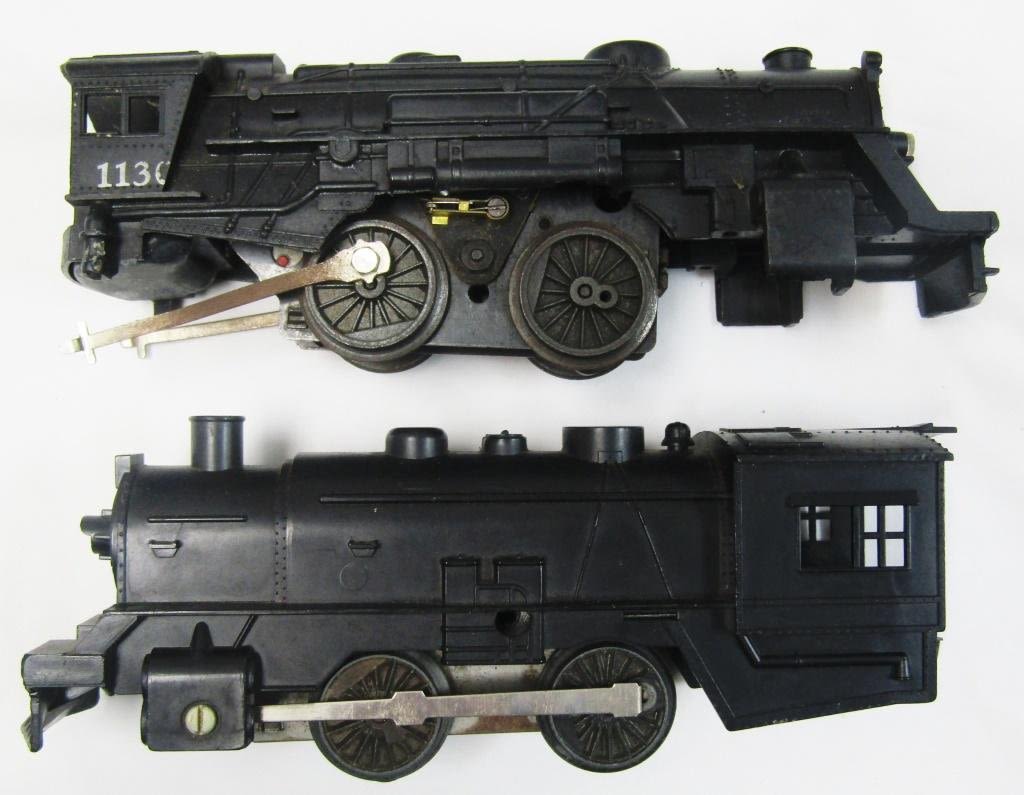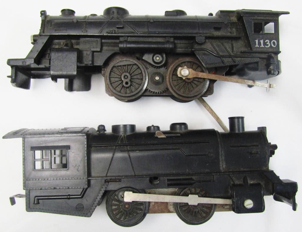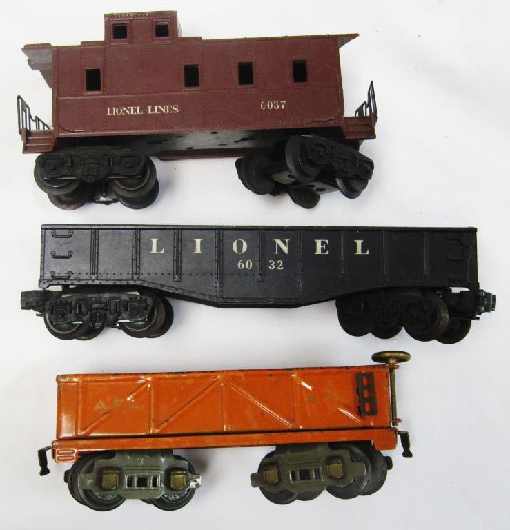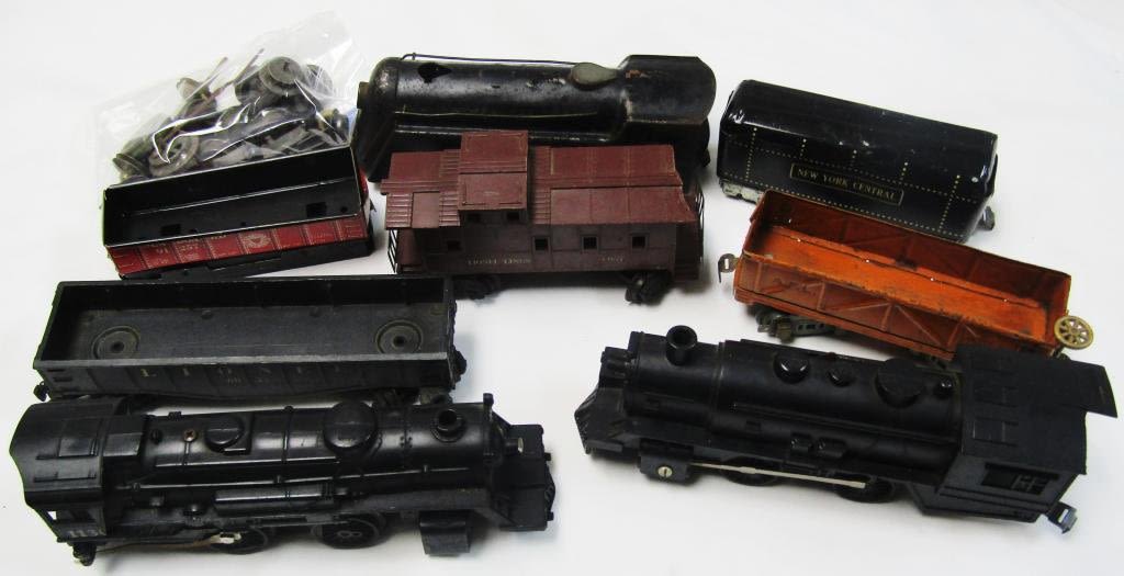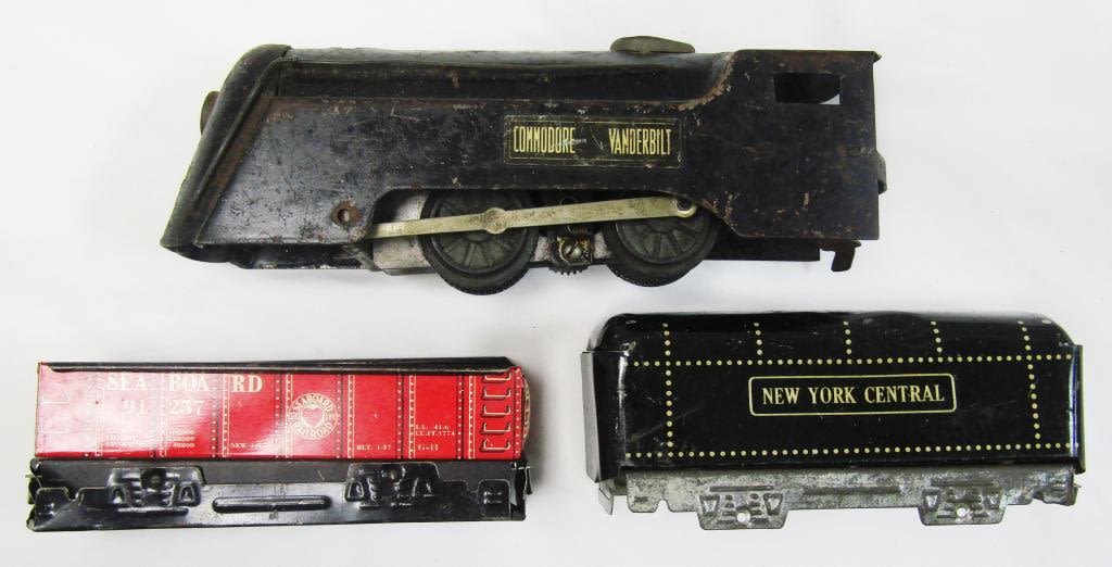 includes LIONEL steam locomotive and 2 cars; COMMODORE VADERBILT ENGINE needs repairs; PLASTIC ENGINE; 3 TIN CARS; 12 curved and 5 straight tracks.