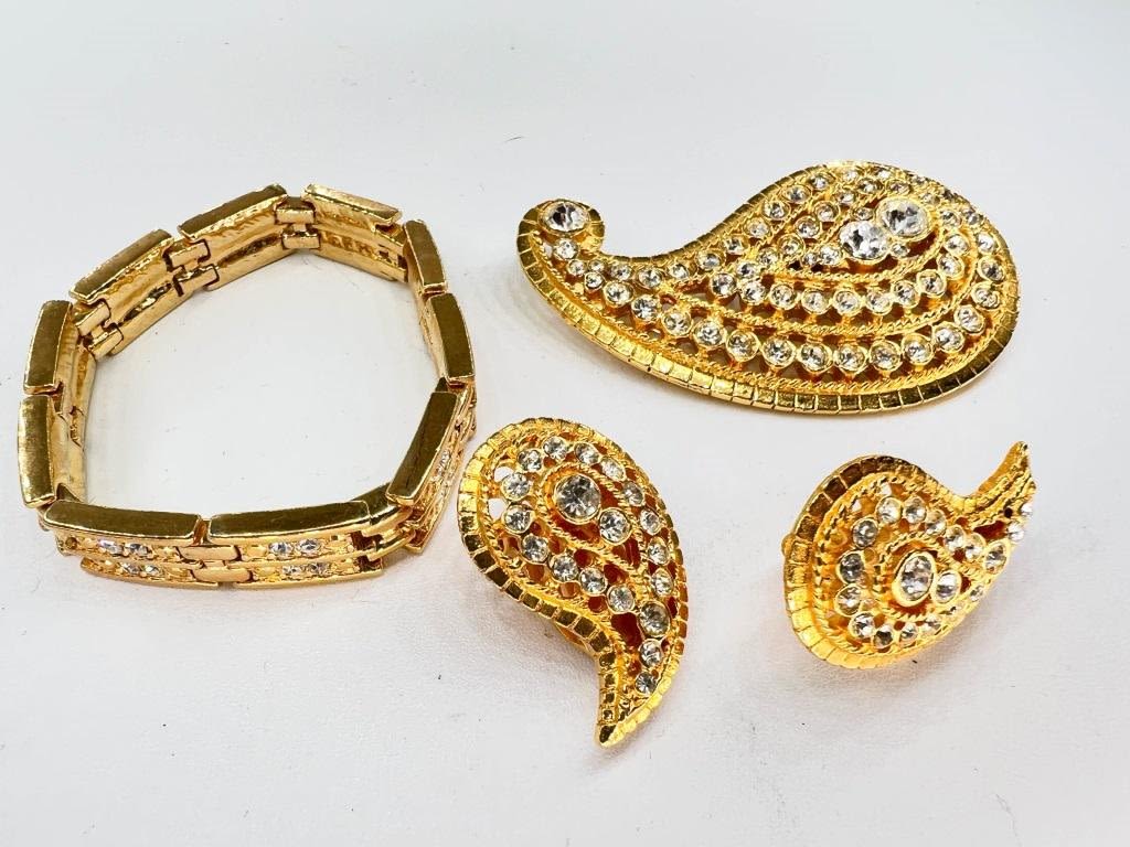 GORGEOUS RHINESTONES ON GOLD TONE FINISH, BROOCH, EARRINGS, BRACELET, SHINY LIGHT CATCHERS