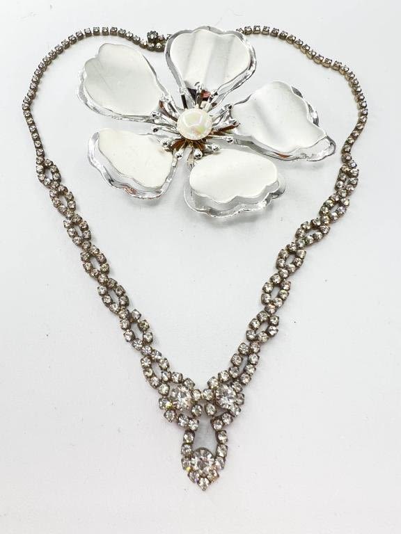 NECKLACE AND BROOCH, RHINESTONES AND SILVERS