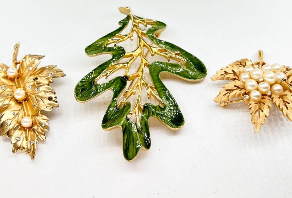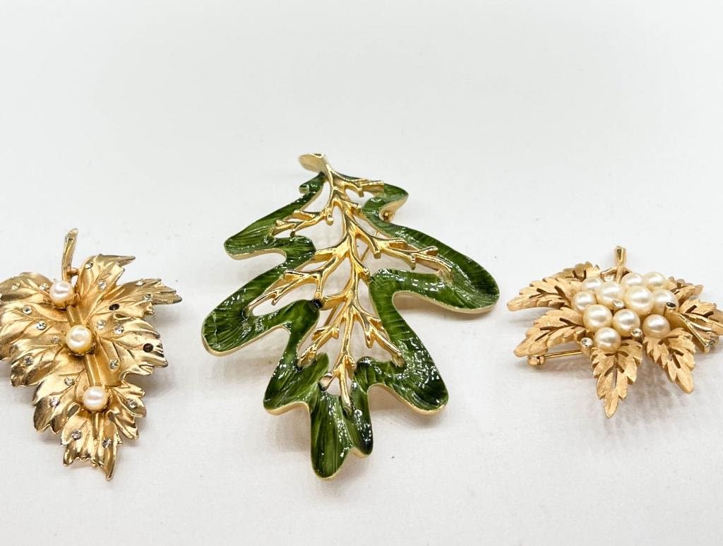3 LEAF BROOCH TRIO , 2 TINY STONES MISSING