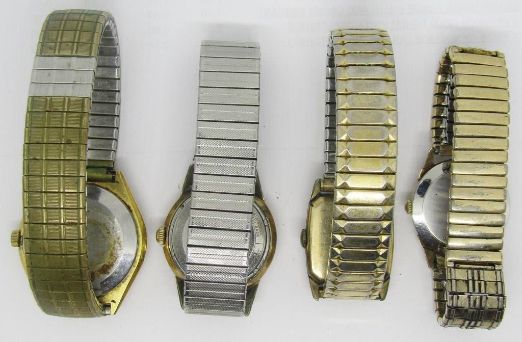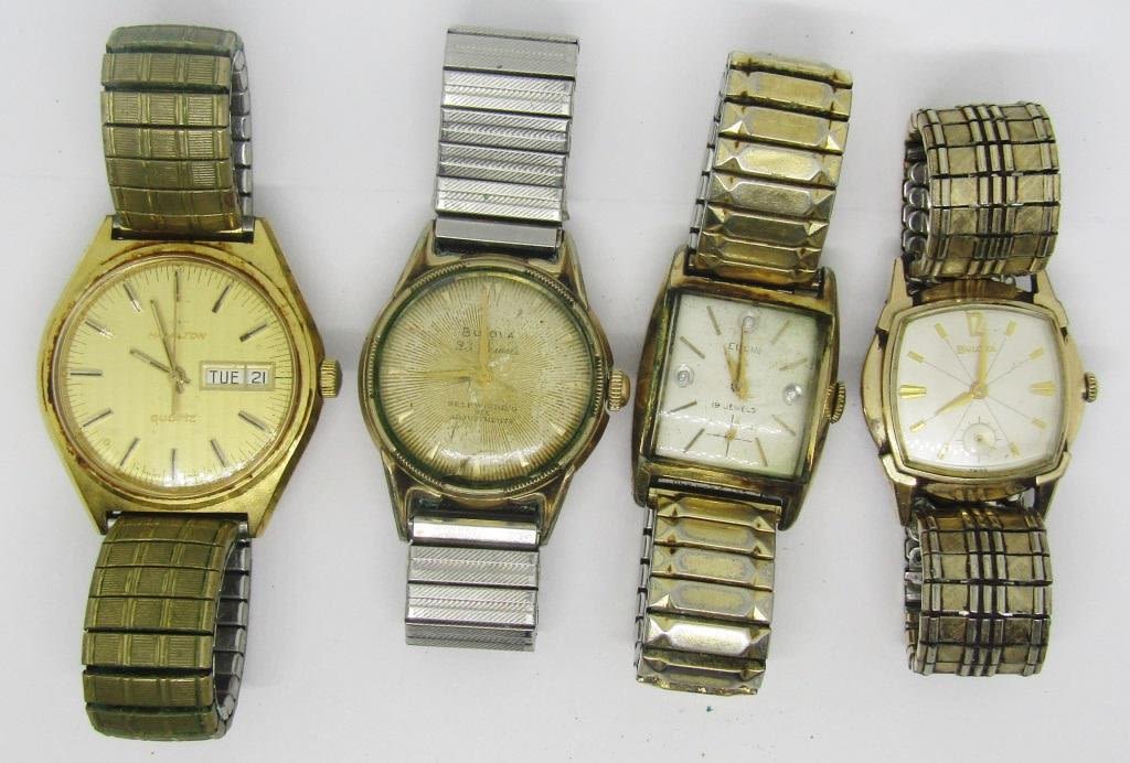 Mens vintage watches. Set of 4 – Bulova, Elgin and Hamilton Brands. All vintage, all elastic bands – Not Tested