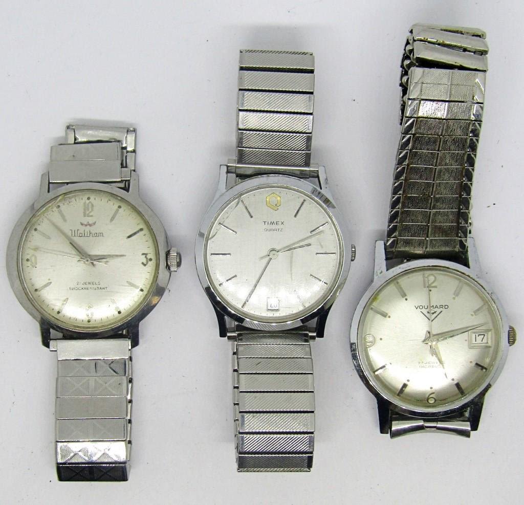 Timex, Waltham, Voumard brand watches, all mens vintage silver toned -non tested watches
