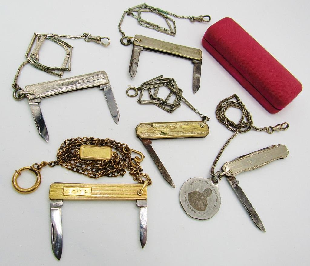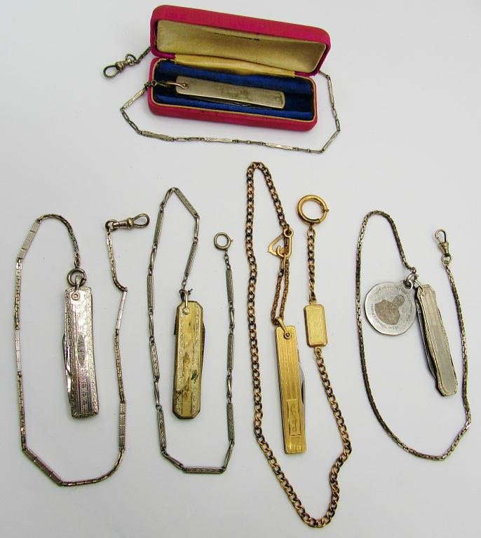 FIVE GOLD AND SILVER TONED SMALL ASSORTED KNIVES W/ 1.5-2.5" BLADES, ALL WITH CHAINS. ONE PINK KNIFE CASE W/ BLUE VELVET INTERIOR