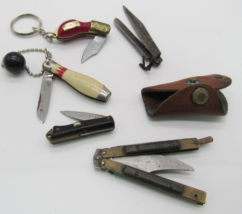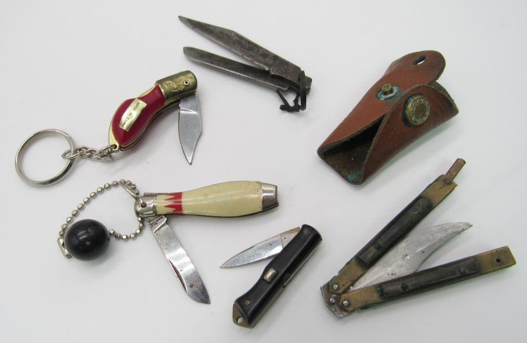 FIVE SMALL ASSORTED POCKET KNIVES, 1-2" BLADES, INCLUDES NOVELTY BOWLING BALL & PIN KEYCHAIN KNIFE