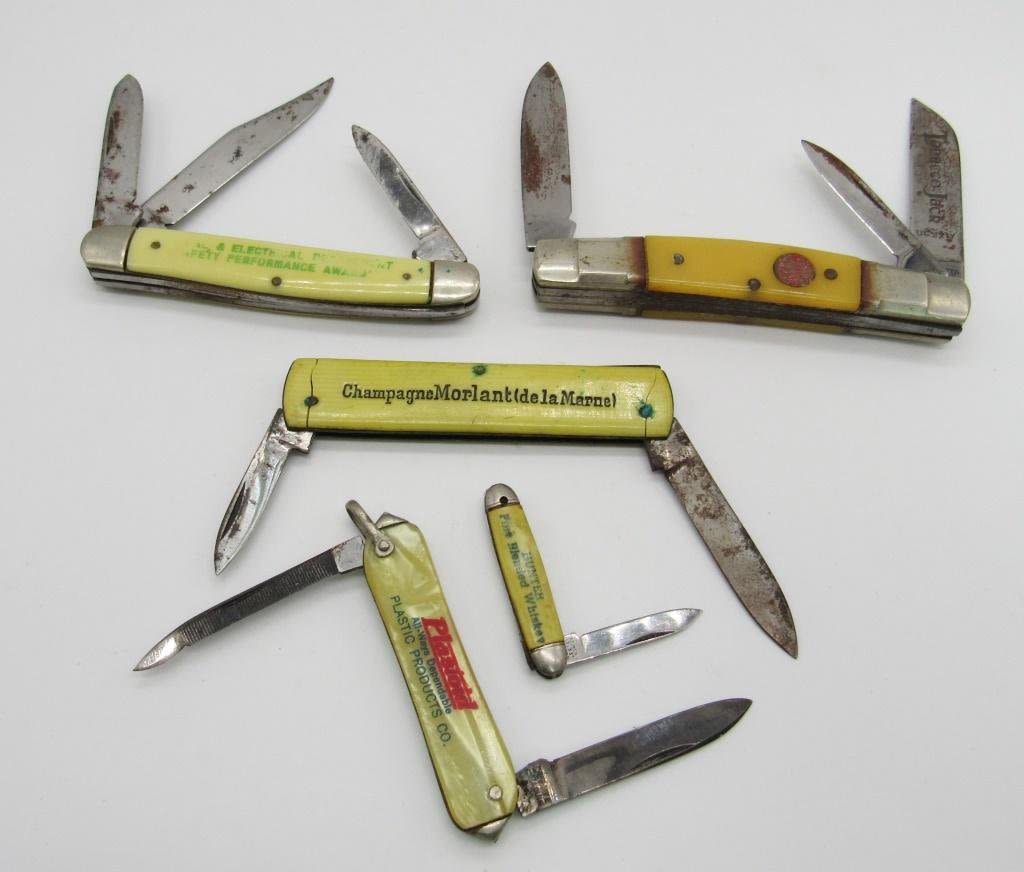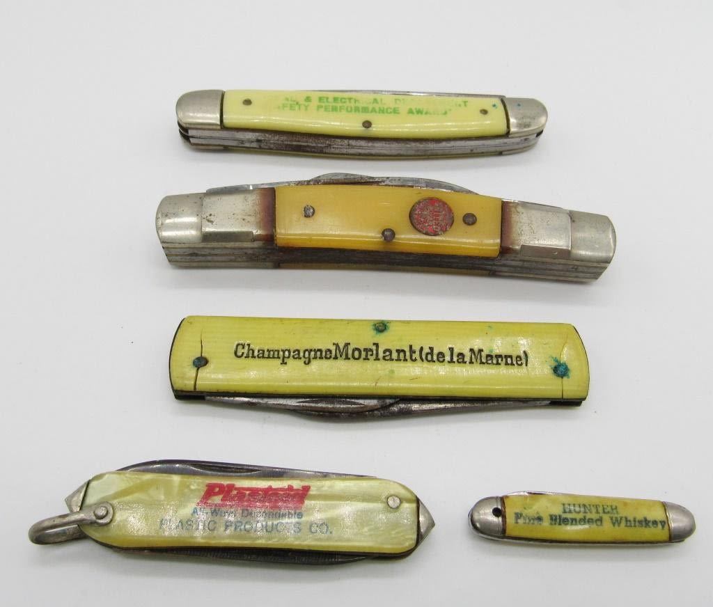 FIVE SMALL ASSORTED KNIVES, SOME BRANDED W/ 1.5-2.5" BLADES