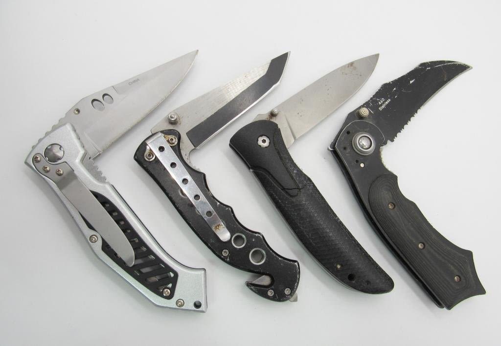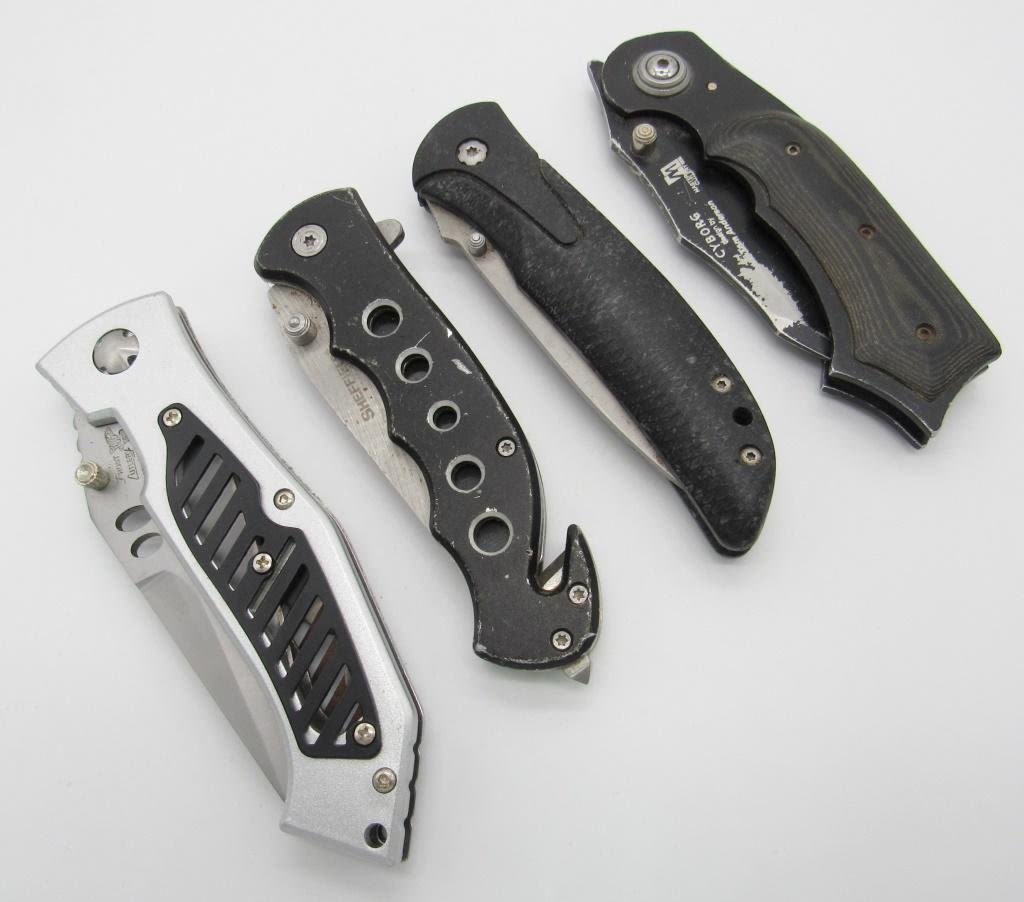 MASTER CUTLERY "CYBORG" 3.5" BLADE W/ BLACK METAL & WOOD HANDLE, SHEFFIELD 3" BLADE W/ BLACK HANDLE, GERBER 3" BLADE W/ BLACK HANDLE, FROST CUTLERY 3" BLADE W/ SILVER & BLACK HANDLE