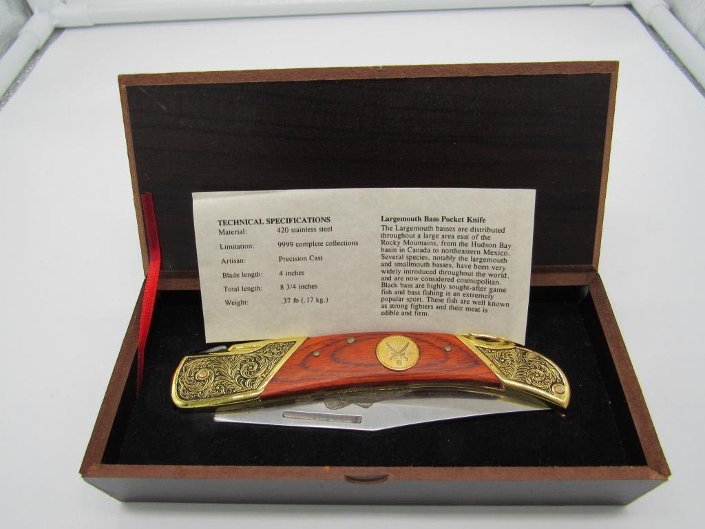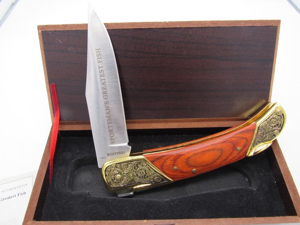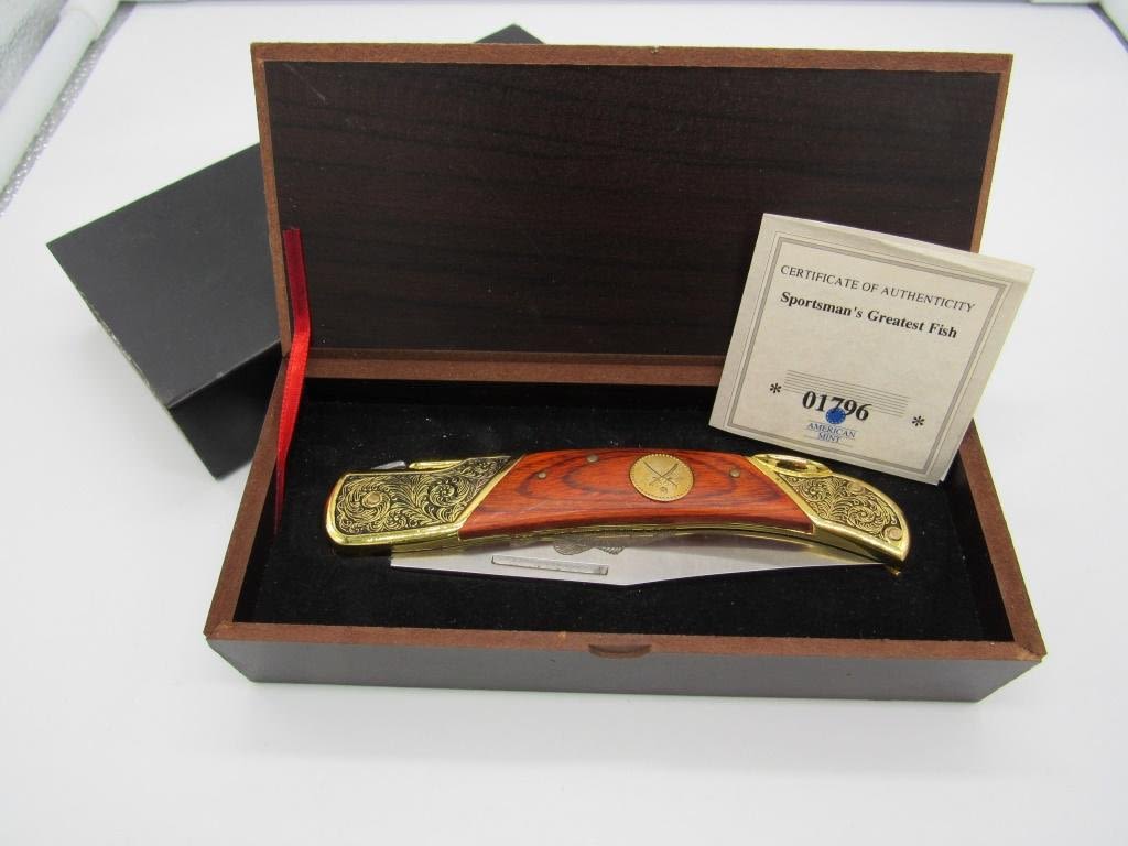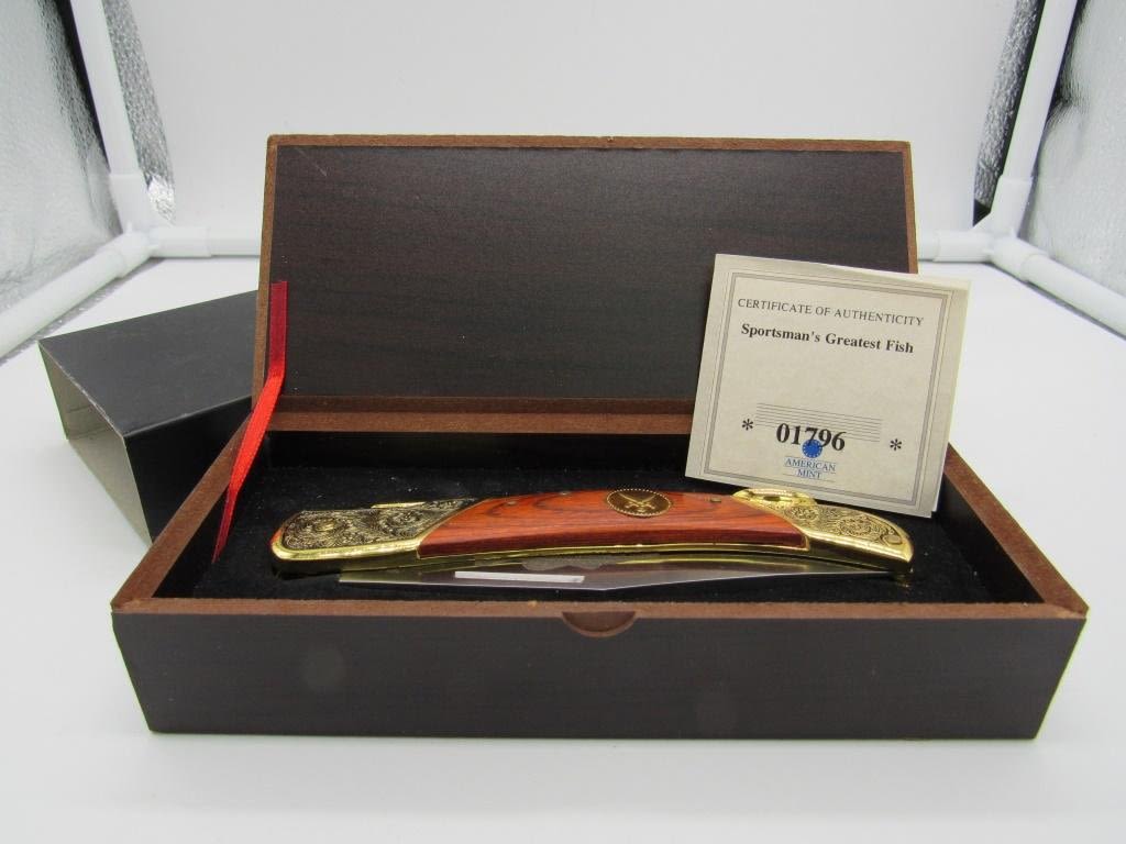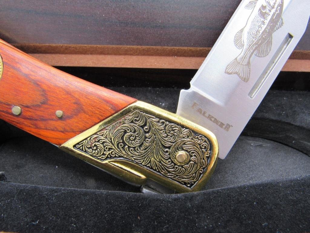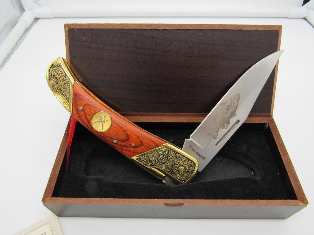 FALKNER COLLECTERS KNIFE, 3.5" BLADE MADE BY ROSTFREI, W/ CERTIFICATE OF AUTHENTICITY & IN ORIGINAL BOX, BEAUTIFULE WOOD HANDLE W/ INTRICATE BLACK AND GOLD TONE DETAILING