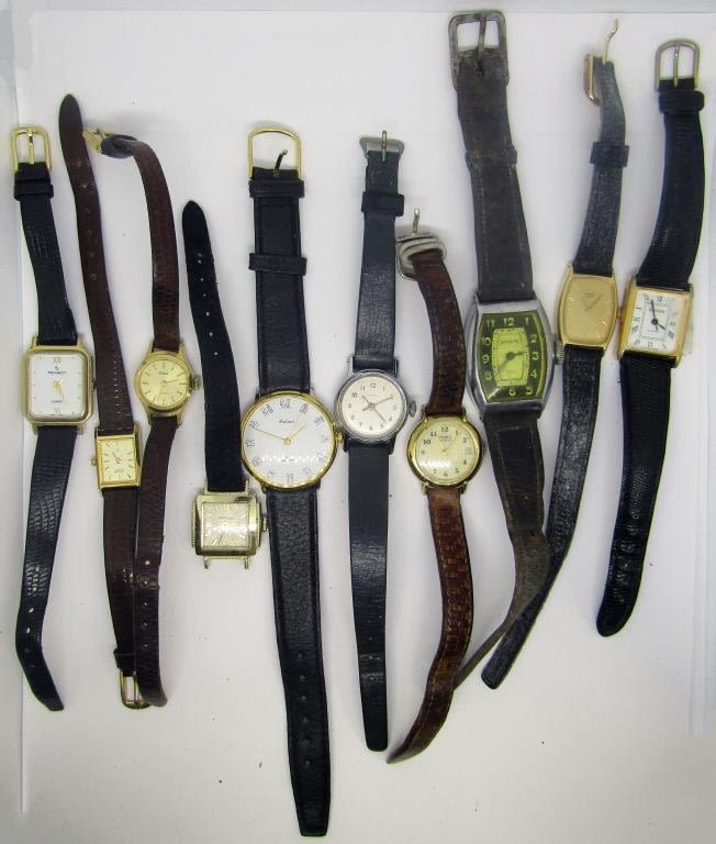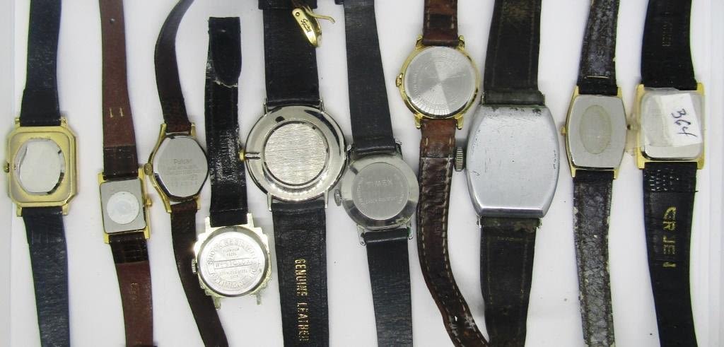 SET OF 10 UNTESTED LADIES WRIST WATCHES W/ LEATHER LIKE BANDS; SEIKO, GRUEN, CITIZEN, INGRAHAM, PULSAR, TIMEX, PEUGEOT, FALIAN, WESTCLOX, & OTHERS