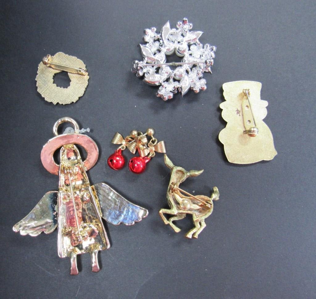 WREATH MARKED FM, ANGEL, REINDEER, SNOMAN BROOCHES + 1 PAIR BELL EARRINGS