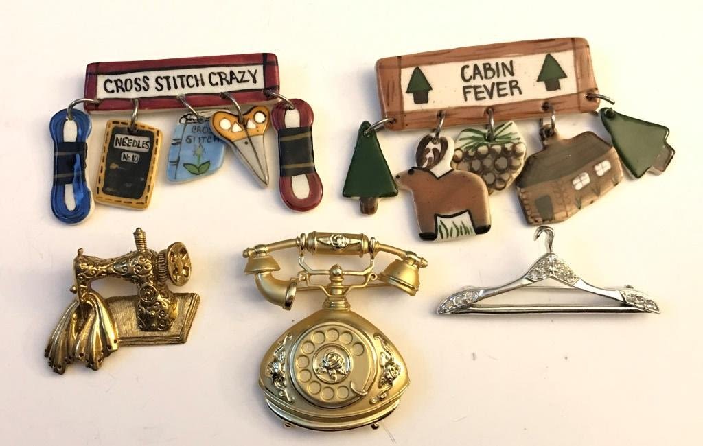 SEWING MACHINE, CAMPING BEAR TREES CABIN, HANGER, CROSS STITCH SCISSORS THREAD, OLD STYLE TELEPHONE
