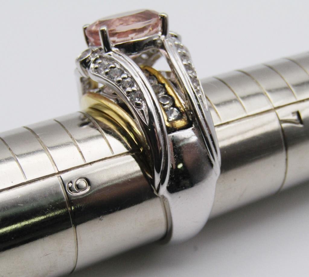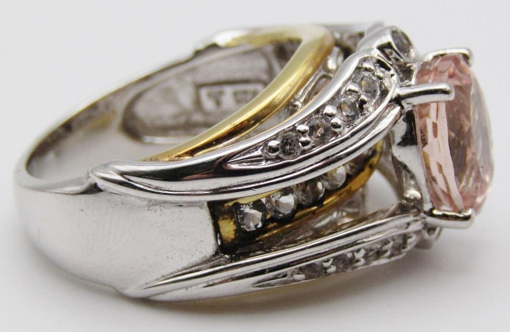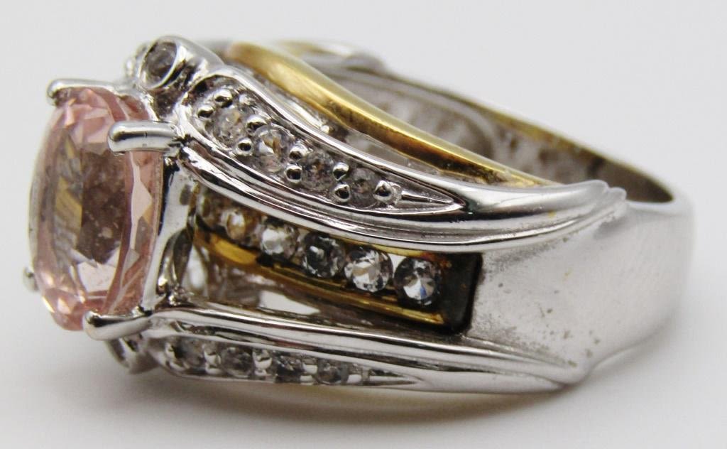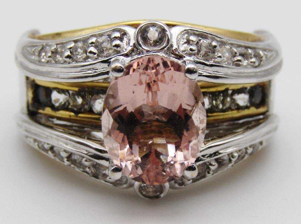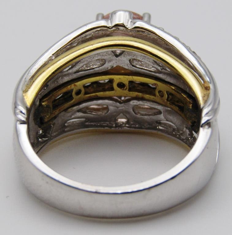 GOLD TONED ACCENTS-PEACH CENTER STONE-CLEAR STONE ACCENTS-RING SIZE 8-TOTAL 6.3 DWT