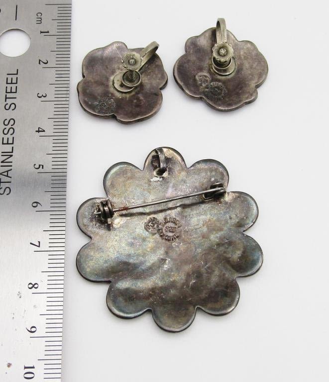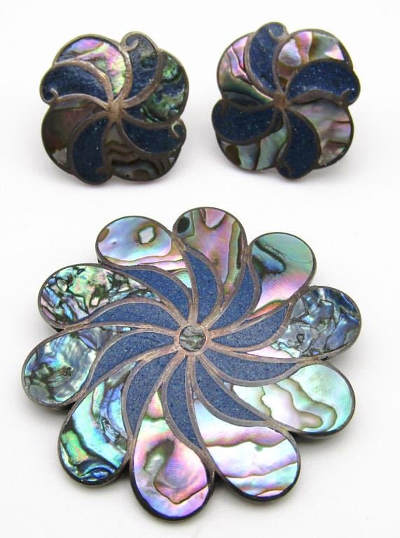 BROOCH WITH BLUE LAPIS AND ABILONE INLAY DESIGN-COMES WITH MATCHING PAIR OF TWIST BACK EARRINGS-TOTAL 11.9 DWT