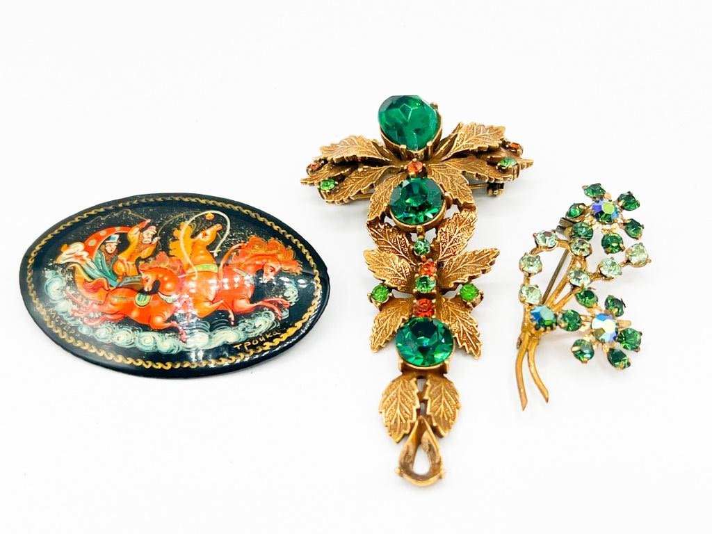 VINTAGE VICTORIAN STYLE BROOCHES WITH GREENS, ONE DRAPE, ONE OVAL, ONE RHINESTONES