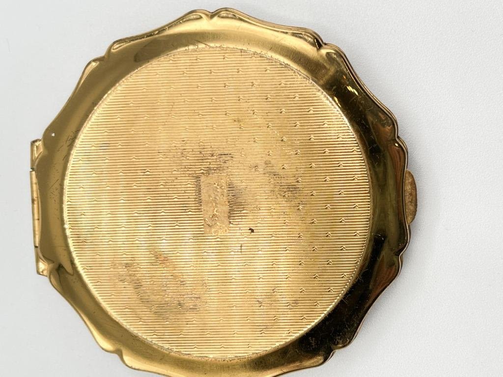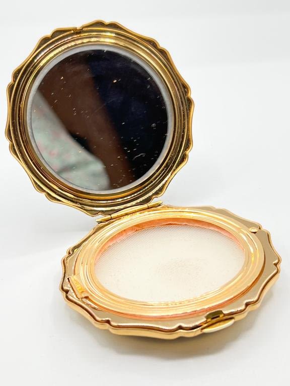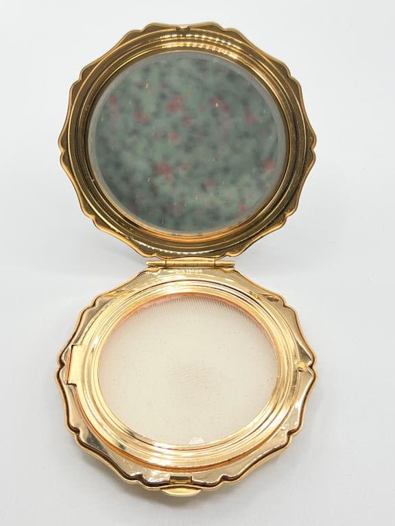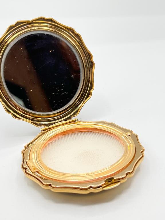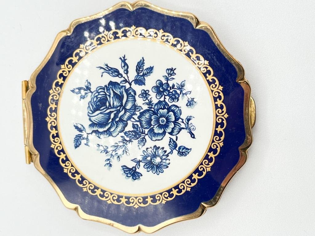 STRATTON ENGLAND MAKEUP POWDER COMPACT Deep Blue Border and Gold Tone intact pattern around the blue roses on crème white background.Marked- Stratton England