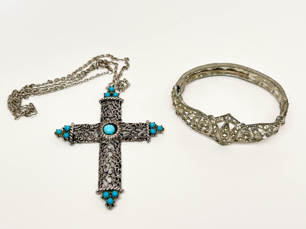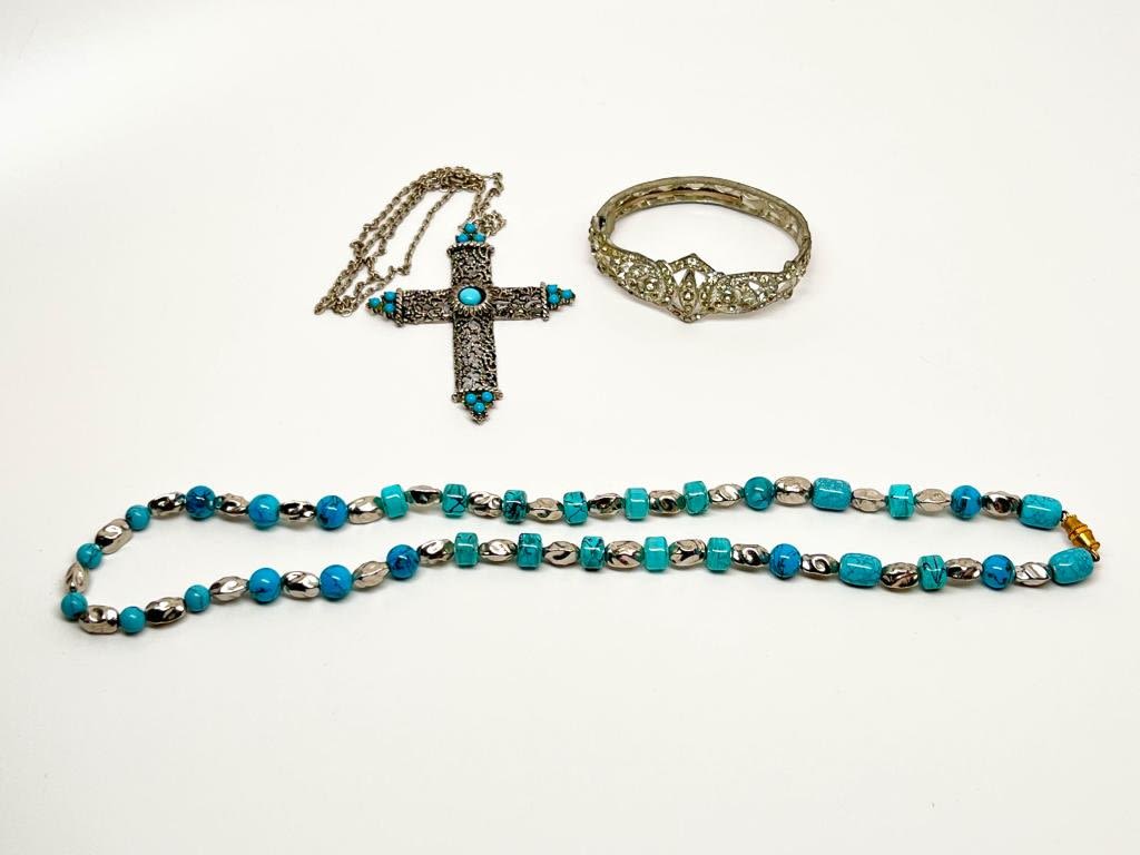 TURQUISE COLOR CROSS AND MORE, NECKLACE WITH MATCHING EARRINGS, ( NO PHOTO)VINTAGE BRACELET