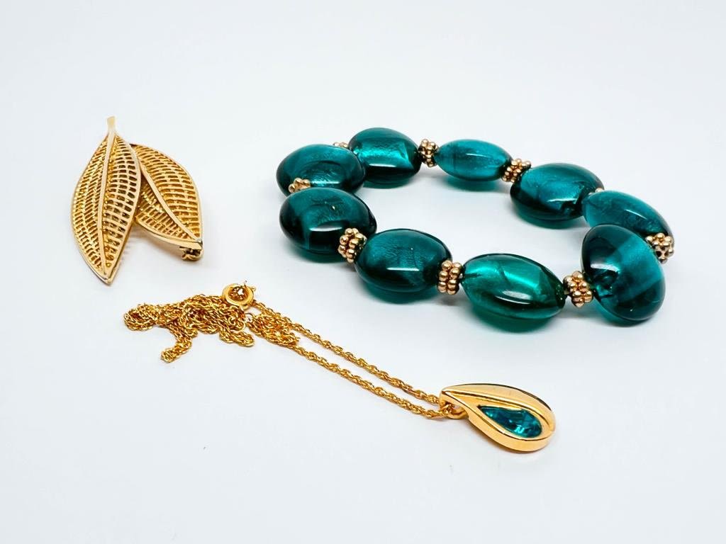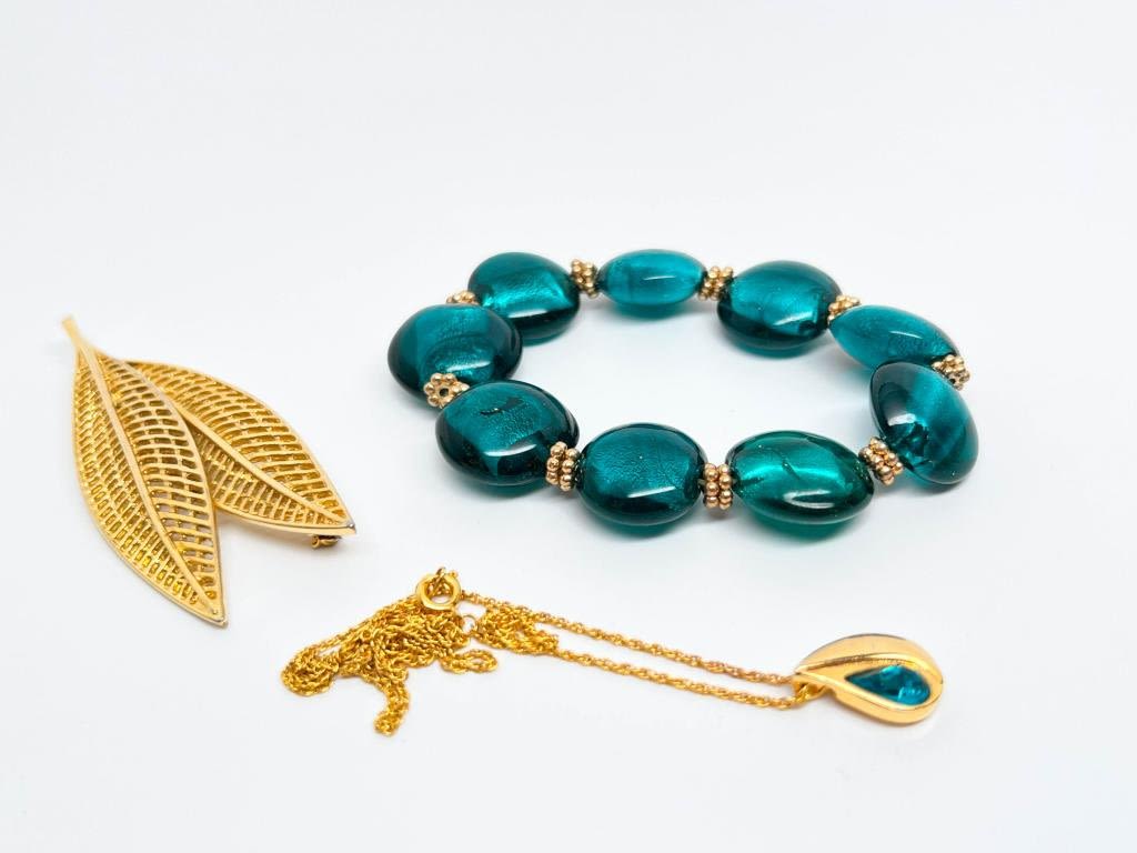 STUNNING GREENS LOT , HEAVY BRACELET, DAINTY NECKLACE AND GOLD LEAF BROOCH